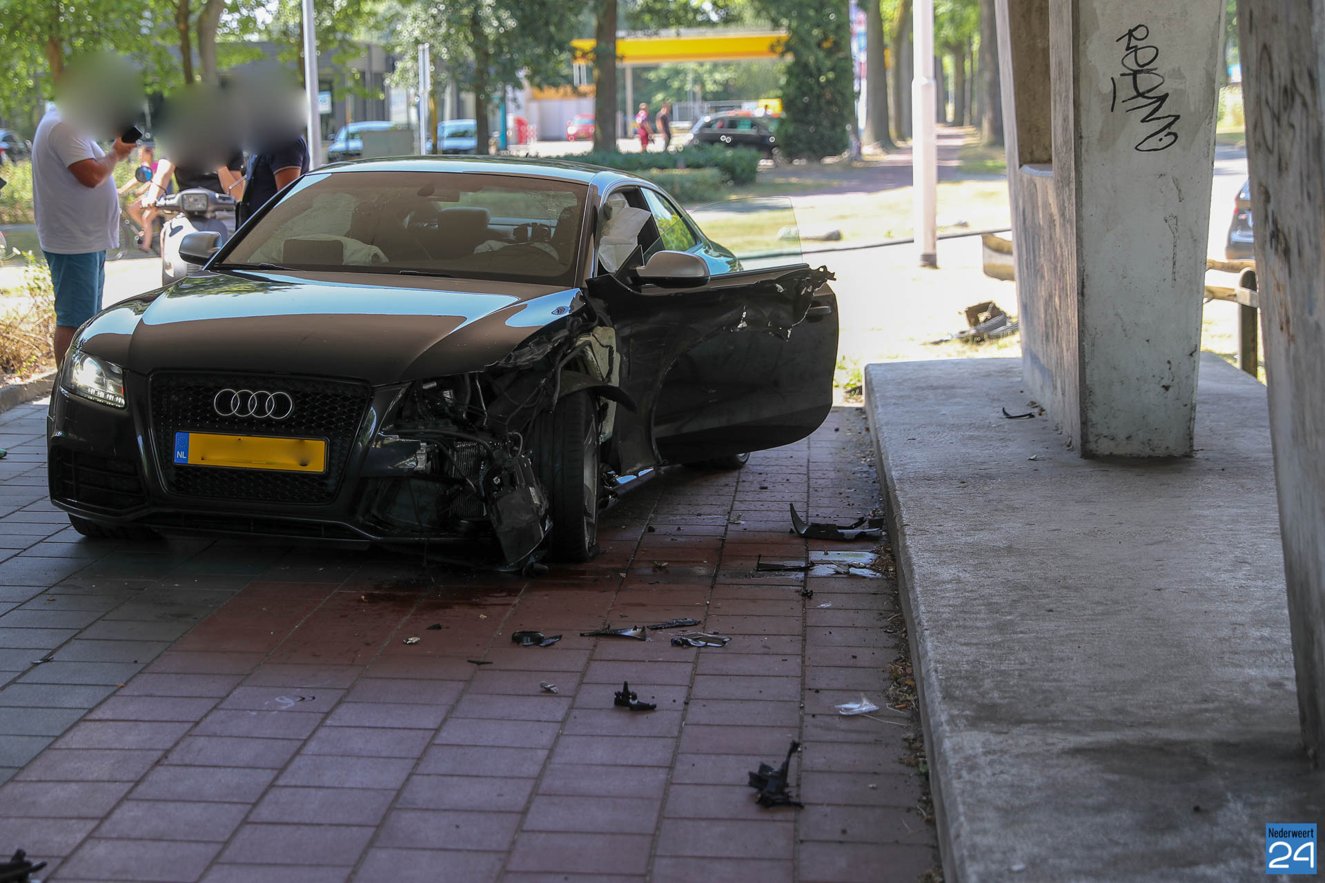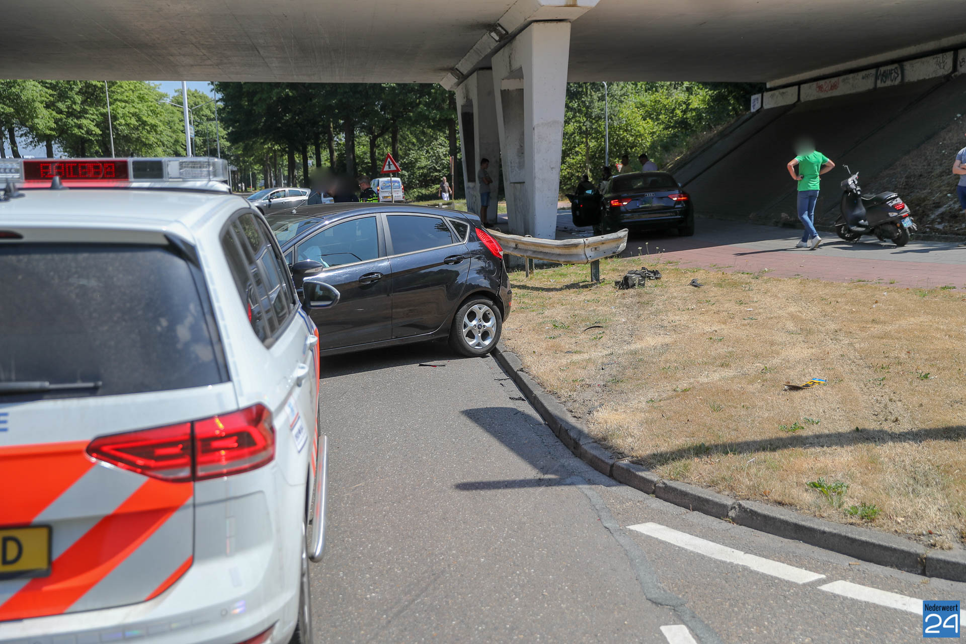 Eén auto spinde om zijn as en de andere auto kwam, nadat hij de peiler van het viaduct op een haar na miste, op het fietspad tot stilstand. Niemand raakte gewond.