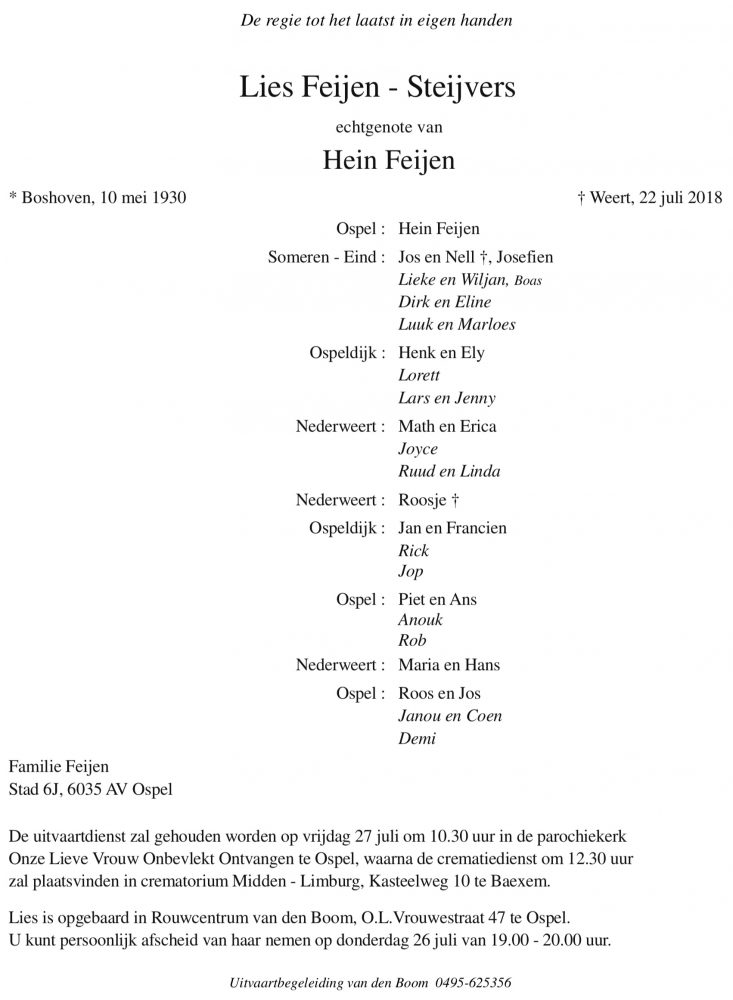 Gecondoleerd met het overlijden van Lies. Heel veel sterkte gewenst in deze ongetwijfeld moeilijke tijd!