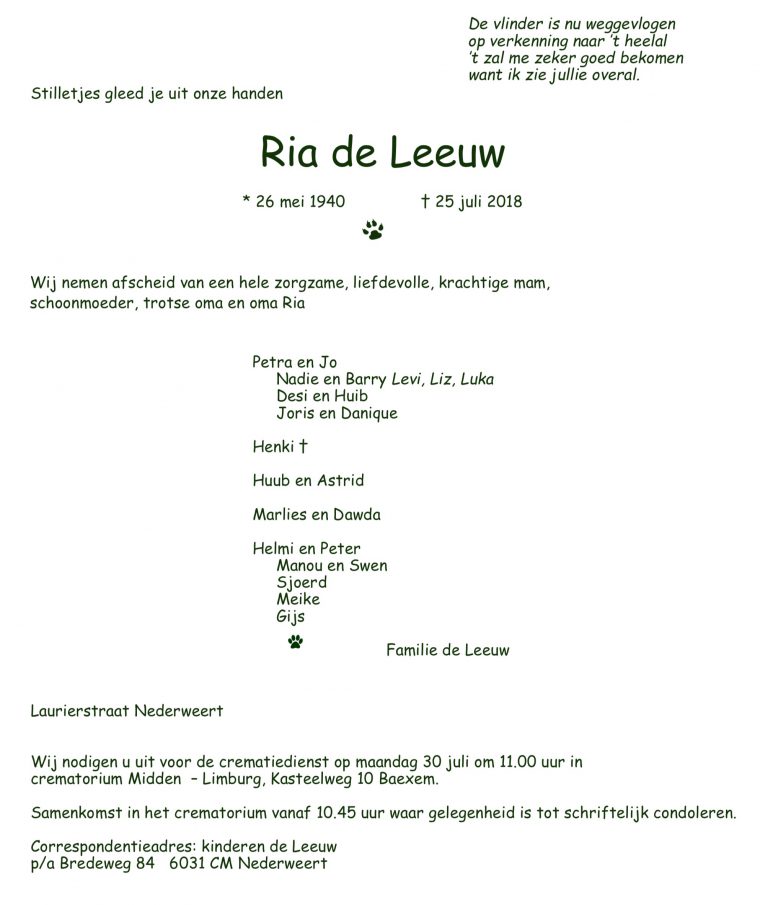 Ik heb Ria leren kennen als een hartelijke spontane vrouw die altijd belangstelling toonde voor haar medemens.