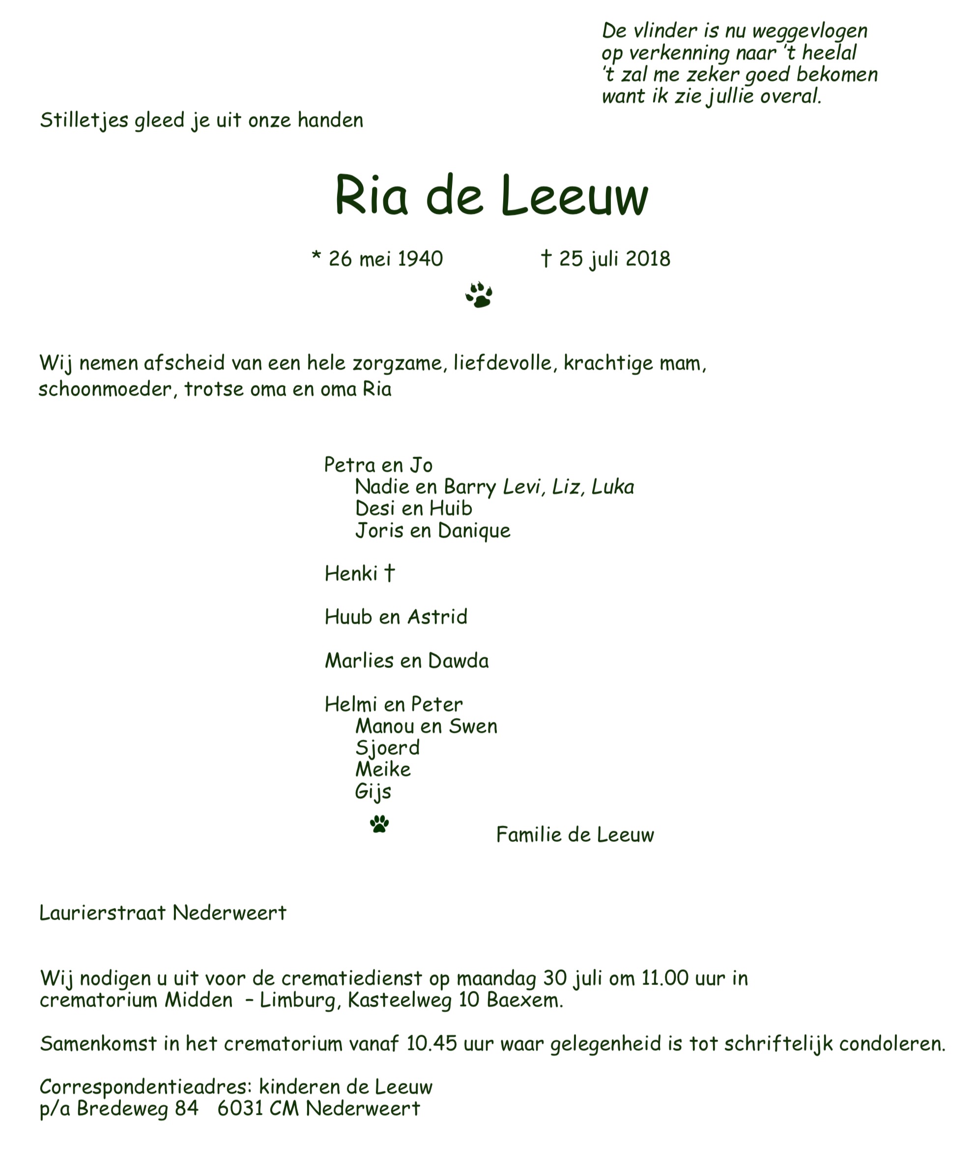 lief mens je zal gemist worden….zoveel gedaan voor mijn moeder niets was je teveel.. Rust zacht Ria . Heel veel sterkte aan iedereen die je achterlaat.
