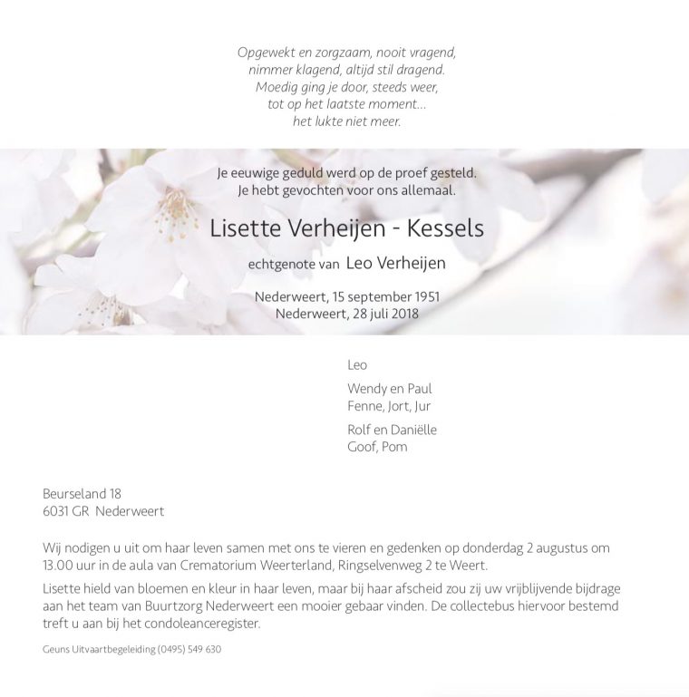 Overlijdensbericht: Lisette Verheijen – Kessels