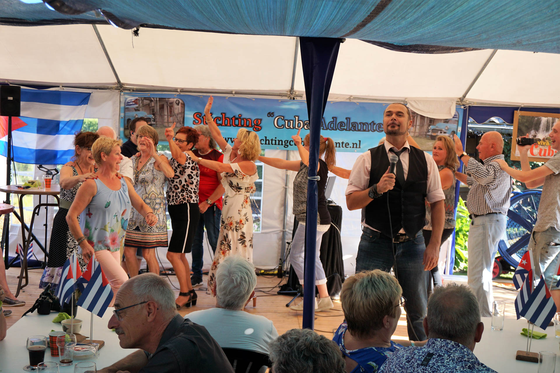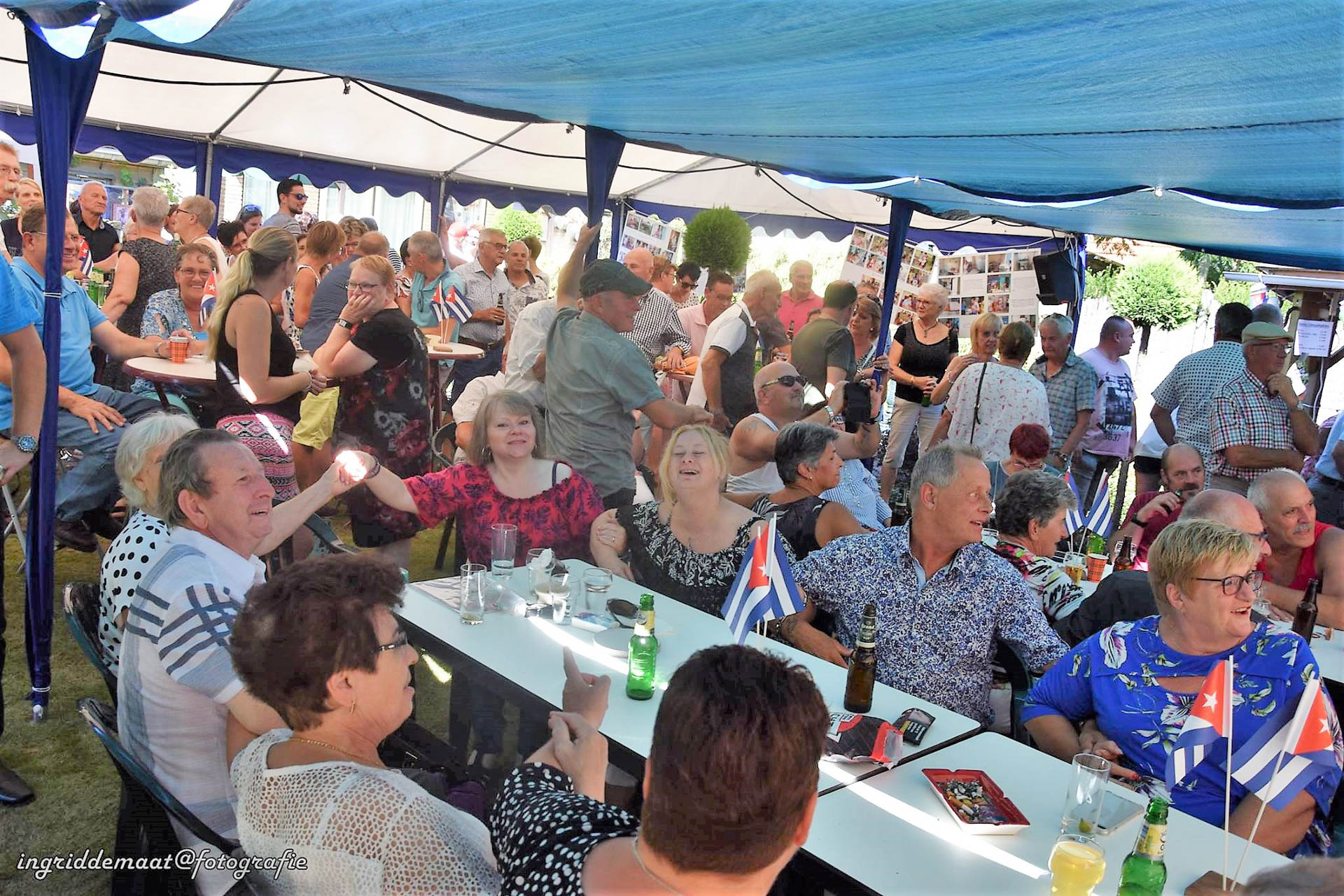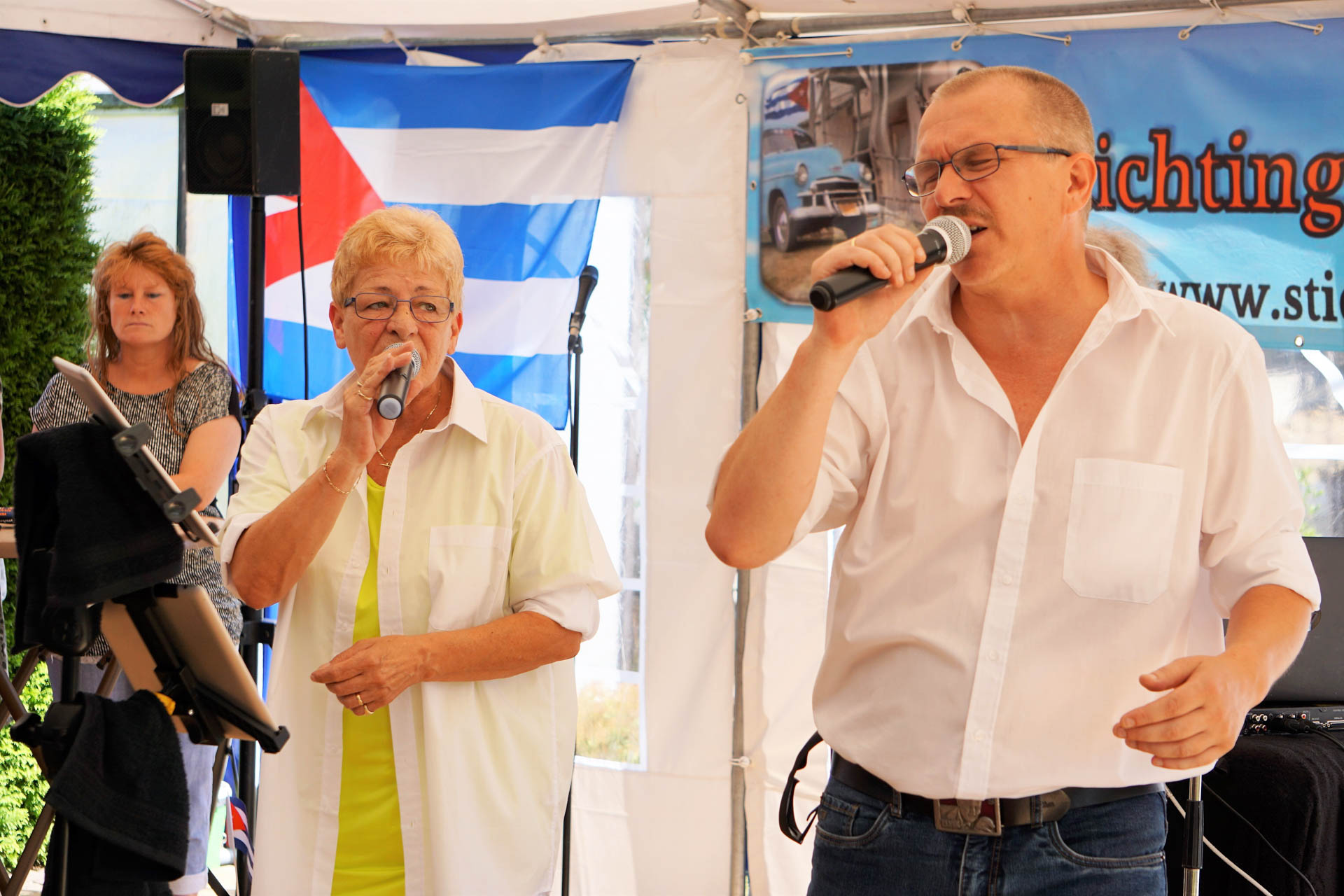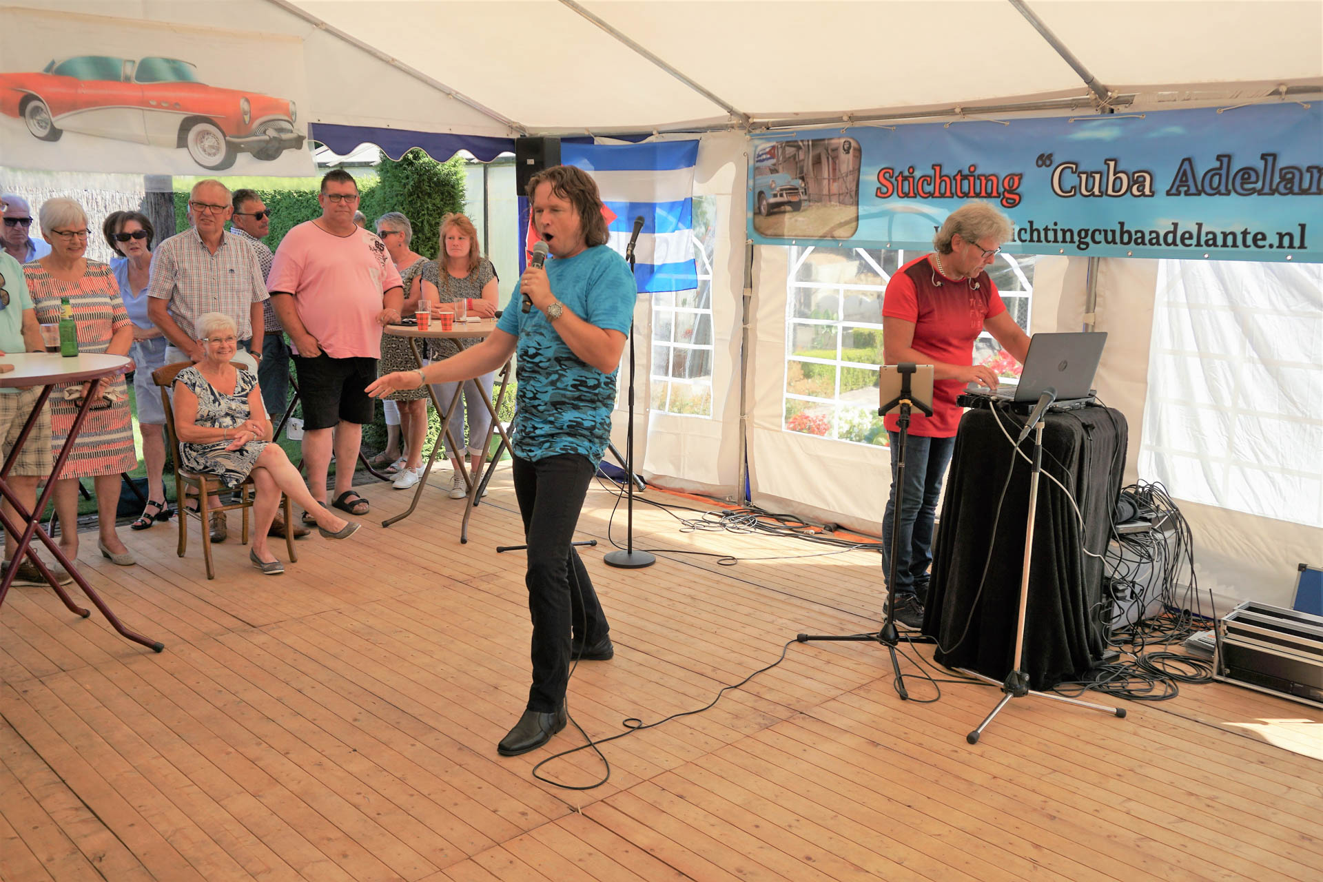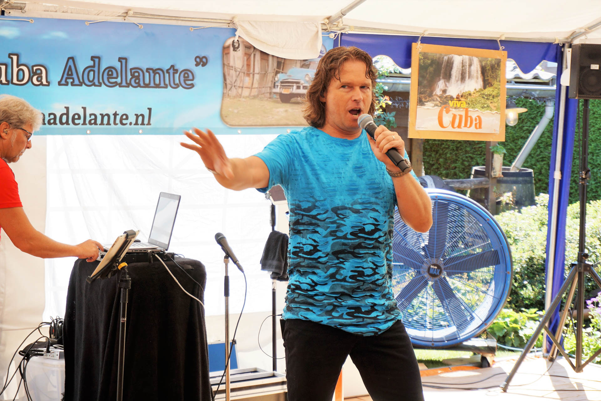 Zondag vond de muziekmiddag van Stichting Cuba Adelante plaats in Nederweert-Eind. Gelukkig was het zondag iets minder warm en de Cubaans ingerichte tenten zorgden tevens voor de nodige schaduw. Er waren foto’s te bekijken van het stichtingswerk van stichting Cuba Adelante van het afgelopen jaar. Kees Plat & Friends bestaat uit allemaal doorgewinterde artiesten met veel ervaring. De groep bestaat uit Kees Plat, Eric Baghuis, Mark van Veen, Gerrie en Ron, Frankie Stardust en Sonja Onderstal. Mark van Veen begon de middag voor 14.00 uur want er waren al veel bezoekers in de tent. Iedere 20 minuten werd er gewisseld van artiest wat zorgde voor een zeer afwisselend aanbod. De mensen genoten volop van de muziek en het warme weer zorgde voor een goede omzet bij de bar.