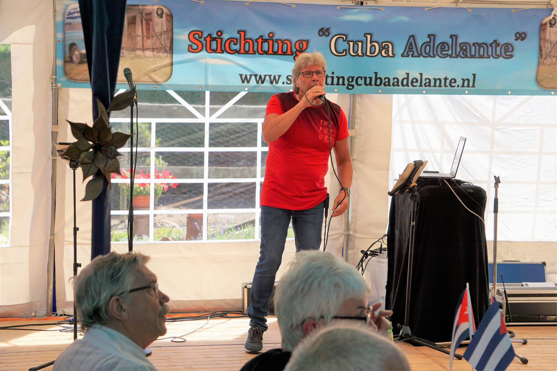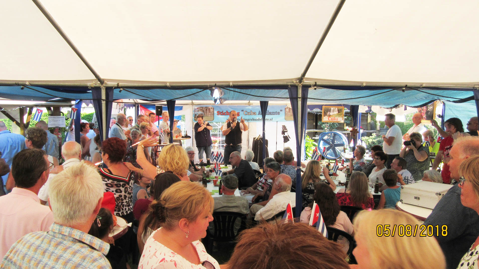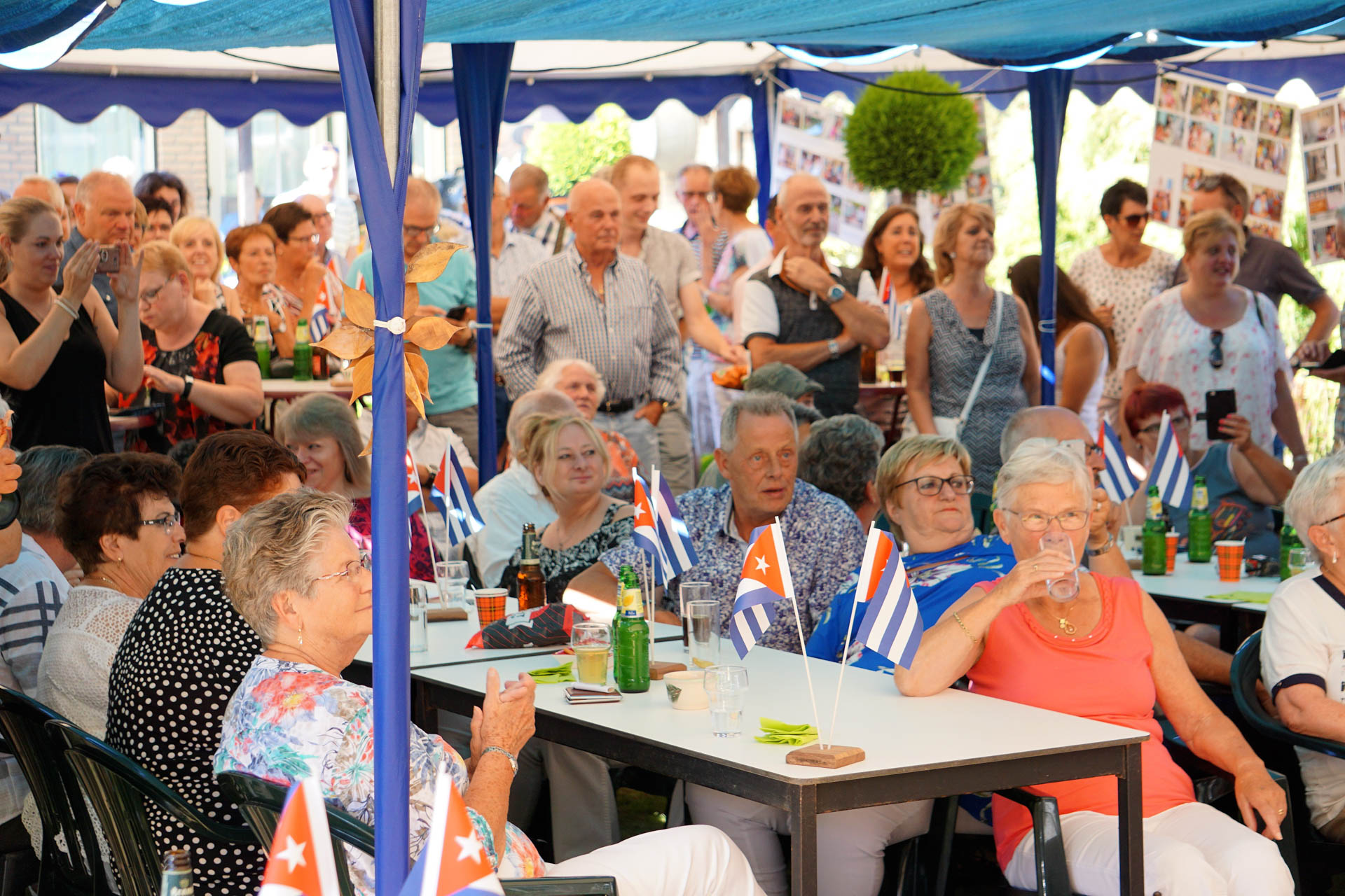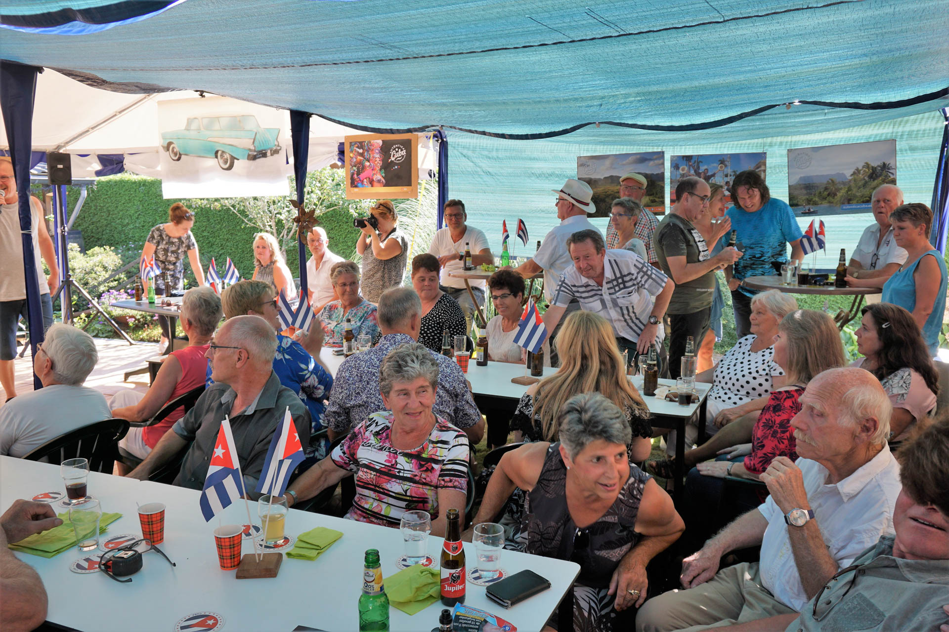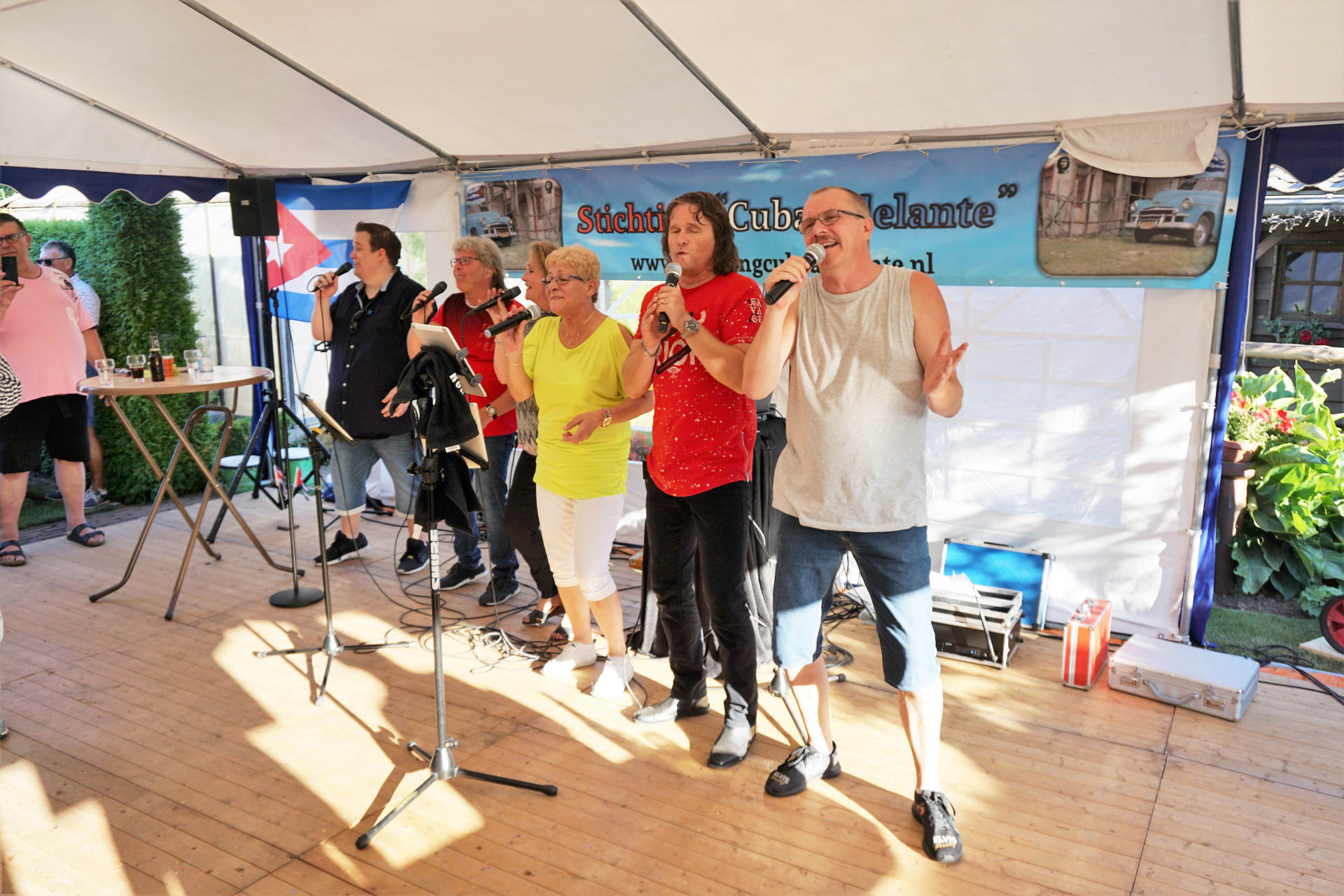 Zondag vond de muziekmiddag van Stichting Cuba Adelante plaats in Nederweert-Eind. Gelukkig was het zondag iets minder warm en de Cubaans ingerichte tenten zorgden tevens voor de nodige schaduw. Er waren foto’s te bekijken van het stichtingswerk van stichting Cuba Adelante van het afgelopen jaar. Kees Plat & Friends bestaat uit allemaal doorgewinterde artiesten met veel ervaring. De groep bestaat uit Kees Plat, Eric Baghuis, Mark van Veen, Gerrie en Ron, Frankie Stardust en Sonja Onderstal. Mark van Veen begon de middag voor 14.00 uur want er waren al veel bezoekers in de tent. Iedere 20 minuten werd er gewisseld van artiest wat zorgde voor een zeer afwisselend aanbod. De mensen genoten volop van de muziek en het warme weer zorgde voor een goede omzet bij de bar.