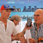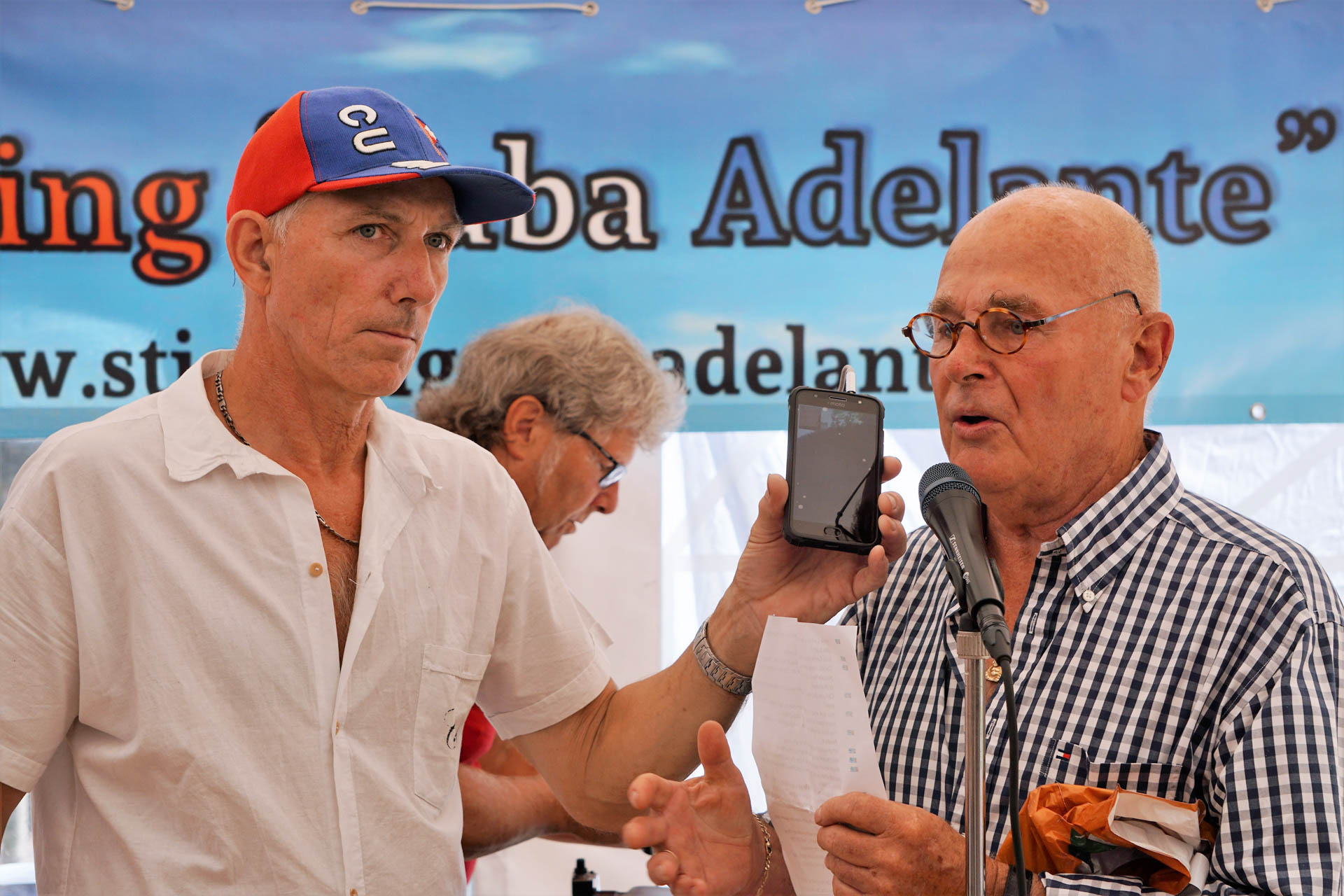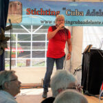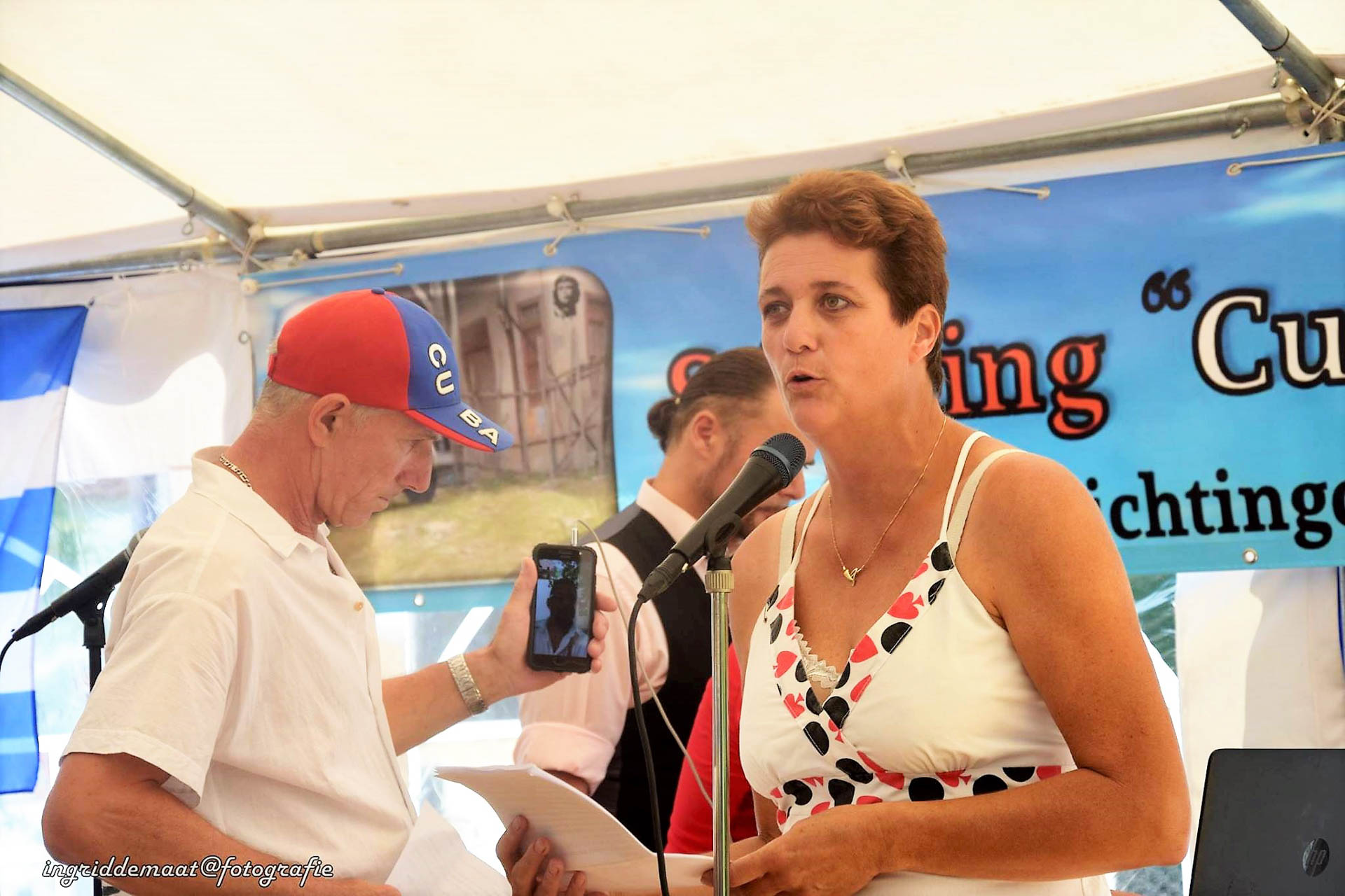 Rond 16.00 uur hielden Mieke en Gerard hun speech over wat er allemaal gerealiseerd is door Stichting Cuba Adelante maar ook over 2 projecten die ze willen verwezenlijken in de weeshuizen. Martin Hoffman uit Lemmer werd naar voren gehaald omdat zijn stichtingswerk, gericht aan het weeshuis voor gehandicapte kinderen, overgenomen is door stichting Cuba Adelante. Zijn contactpersoon Carlos werkt sinds een jaar ook voor Stichting Cuba Adelante. Aangezien hij afgelopen jaar het meeste werk voor de stichting heeft gedaan, heeft Gerard, met behulp van IMO videobellen, contact opgenomen met Carlos. Martin stelde een aantal vragen aan Carlos betrekking hebbende op de projecten die we willen doen dit jaar. Carlos verduidelijkte het één en ander maar hij bedankte ook alle aanwezige mensen ontzettend voor alle giften zodat ze de weeshuizen maar ook arme families kunnen blijven helpen. Ook Elsa, de vrouw die we afgelopen juni een rolstoel en een nieuw bed gegeven hebben, was met Carlos meegekomen naar het plein Jose Marti in Holguin. Er is alleen wifi aanwezig op de pleinen in Holguin. Carlos en Elsa kregen na afloop een groot applaus van alle aanwezigen.