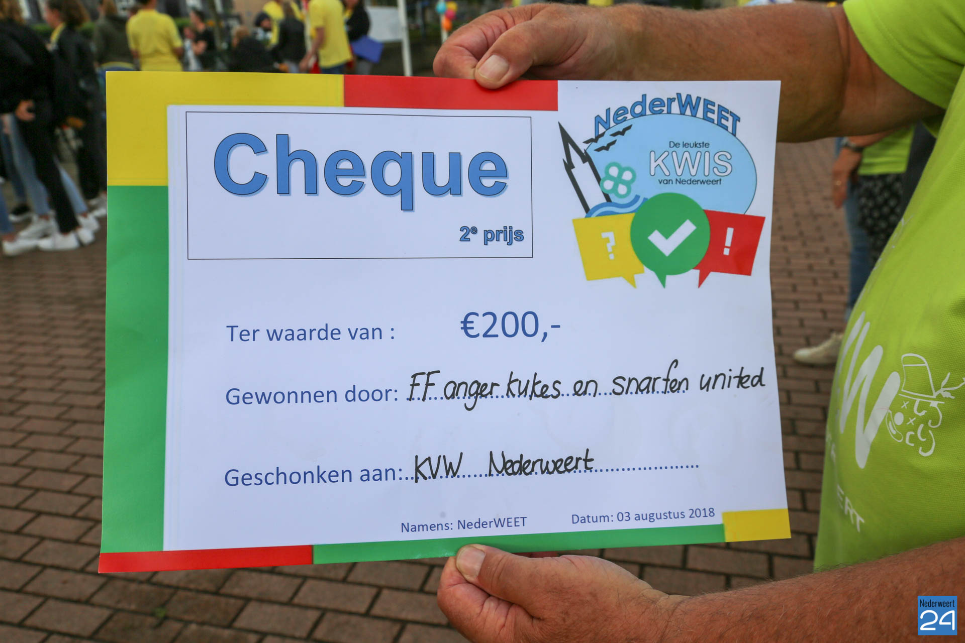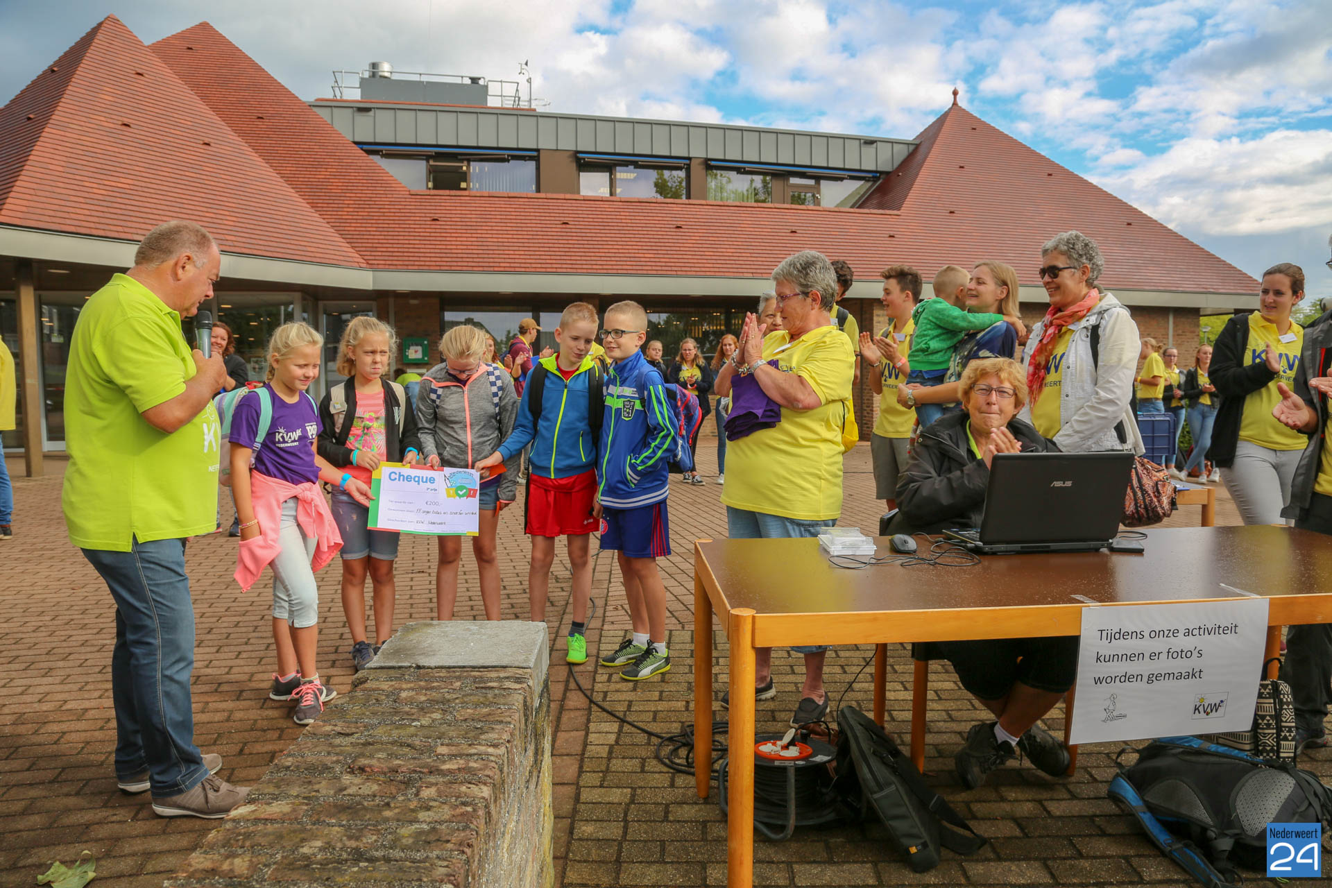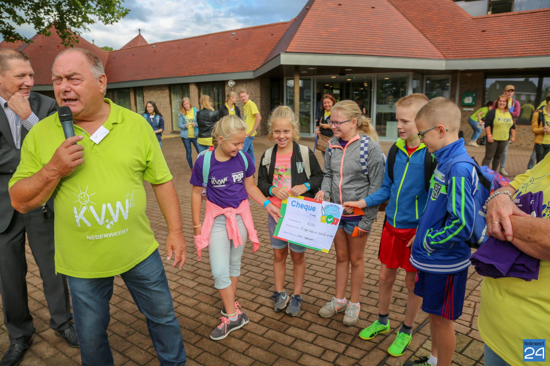 Maandagochtend is het jaarlijkse Kindervakantiewerk van start gegaan. Op het Raadhuisplein verzamelden ruim 300 kinderen zich voor de officiële opening. Dit jaar bestaat KVW Nederweert 50 jaar. Extra reden voor een feestje! Tjeu Stultiens én wethouder Peter Koolen van de gemeente Nederweert hebben de opening verzorgd. Door een deelnemende groep van de NederWeet Kwis werd een cheque overhandigd van maar liefst €200,- euro!. Tjeu Stultiens nam deze in ontvangst.