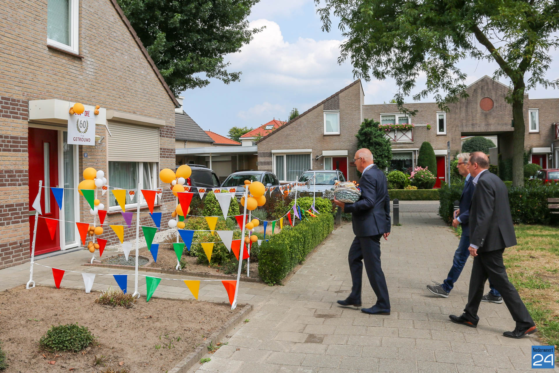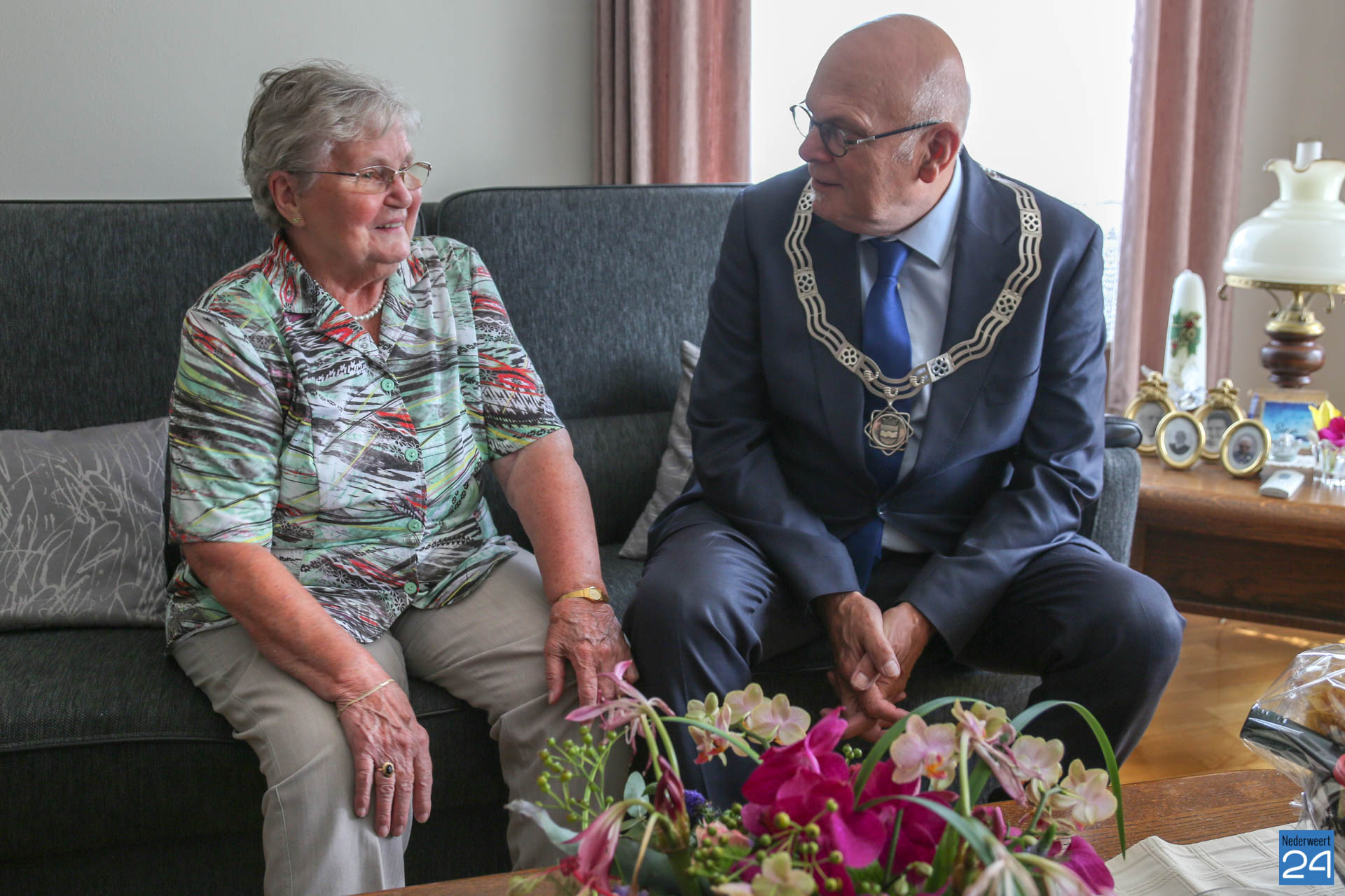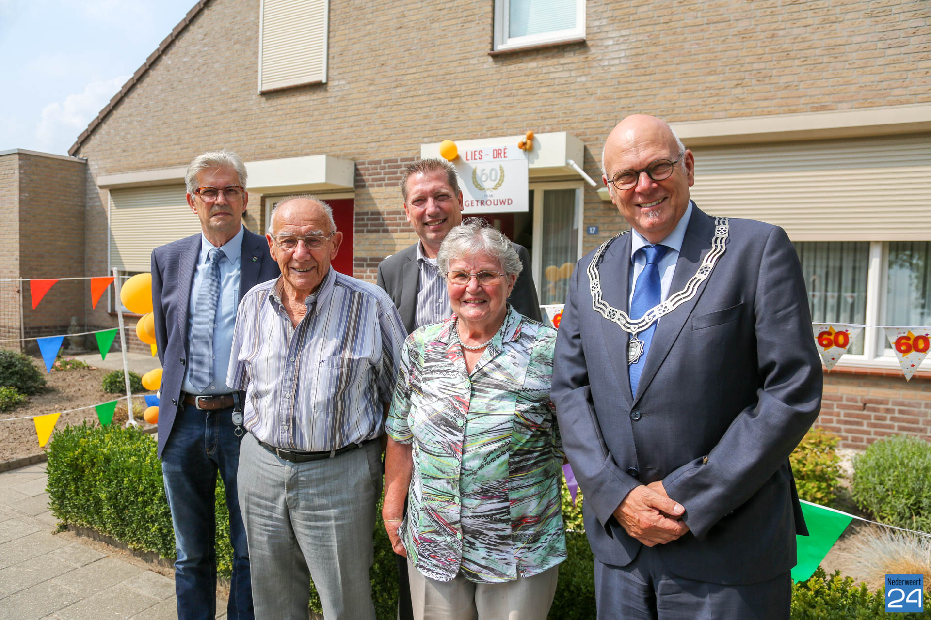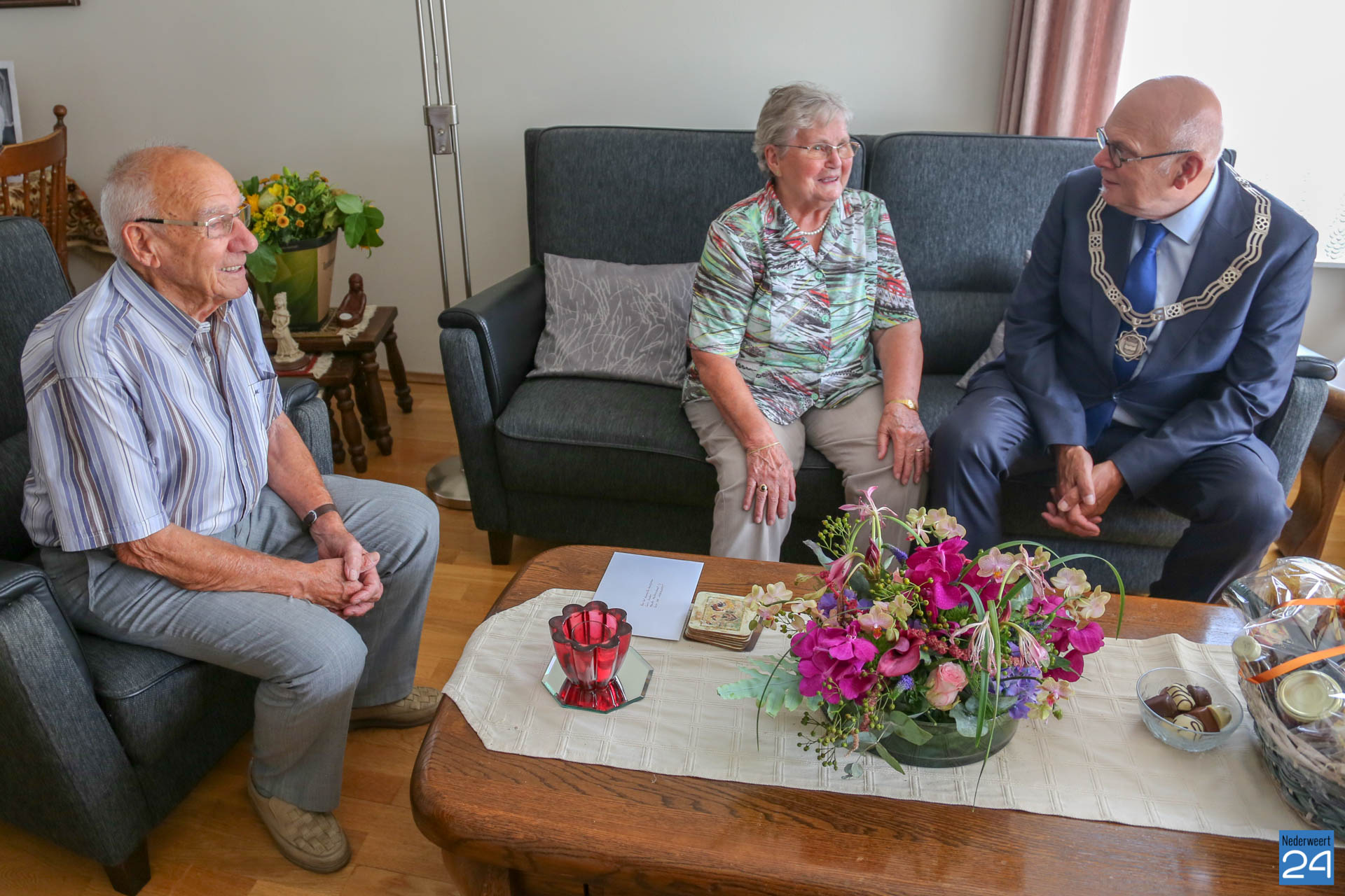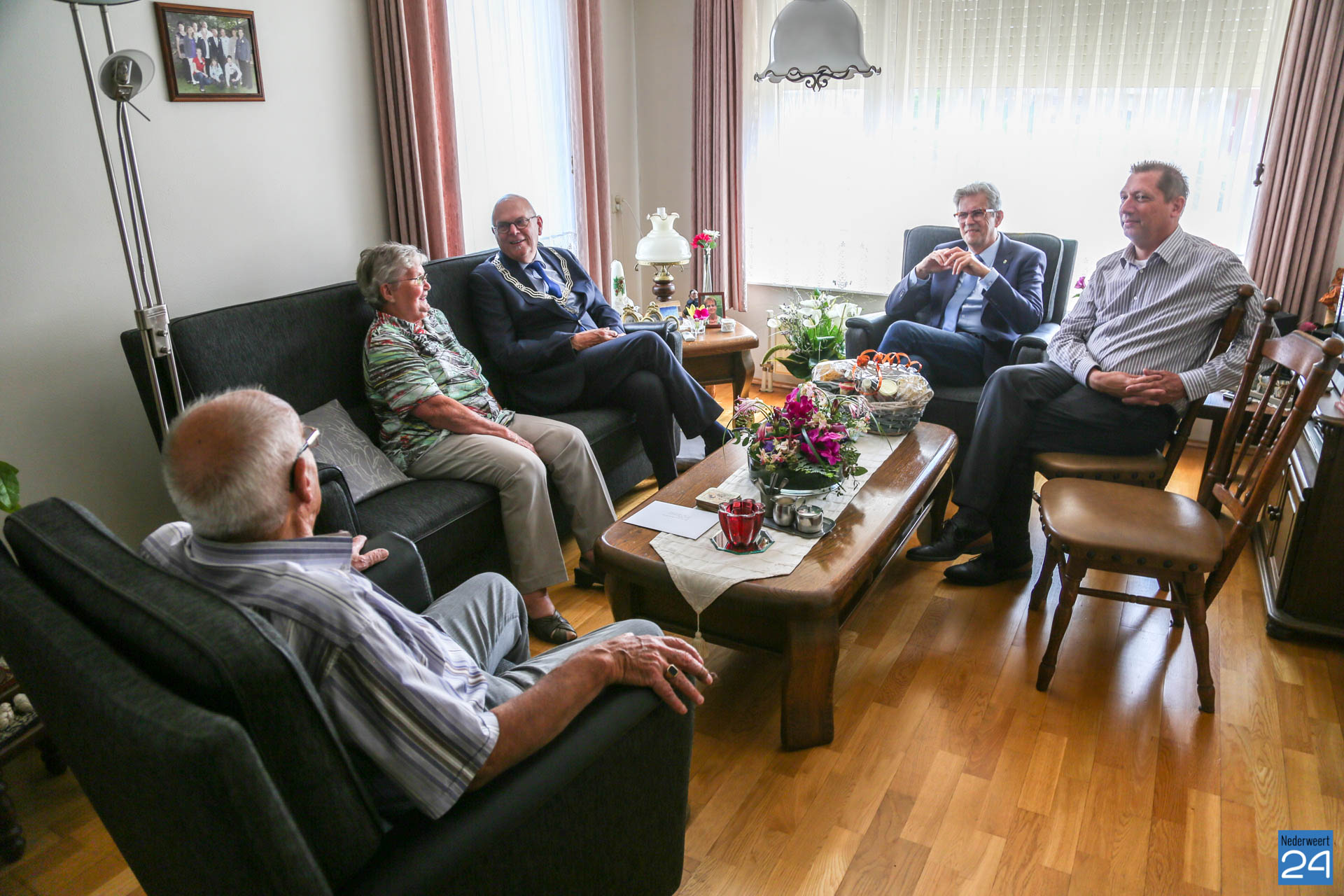 Dinsdagmiddag zijn burgemeester Evers en de wethouders Voss en Koolen op bezoek geweest bij het diamanten bruidspaar Dré en Lies Caris-Koolen om het stel te feliciteren.