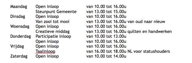 Naast deze open inloop kun je op donderdag tussen 10.00 en 12.00 uur ook terecht met vragen over de Participatiewet en is dezelfde dag tussen 13.00 en 15.00 uur ondersteuning aanwezig voor kleine computerproblemen of vragen over mobiele apparatuur. Op woensdag van 13.00 tot 15.00 uur is een ruimte beschikbaar voor creatievelingen om hun hobby te delen met anderen. Vrijdags zijn van 16.00 tot 18.00 uur taalcoaches aanwezig voor statushouders en andere Nederweertenaren.