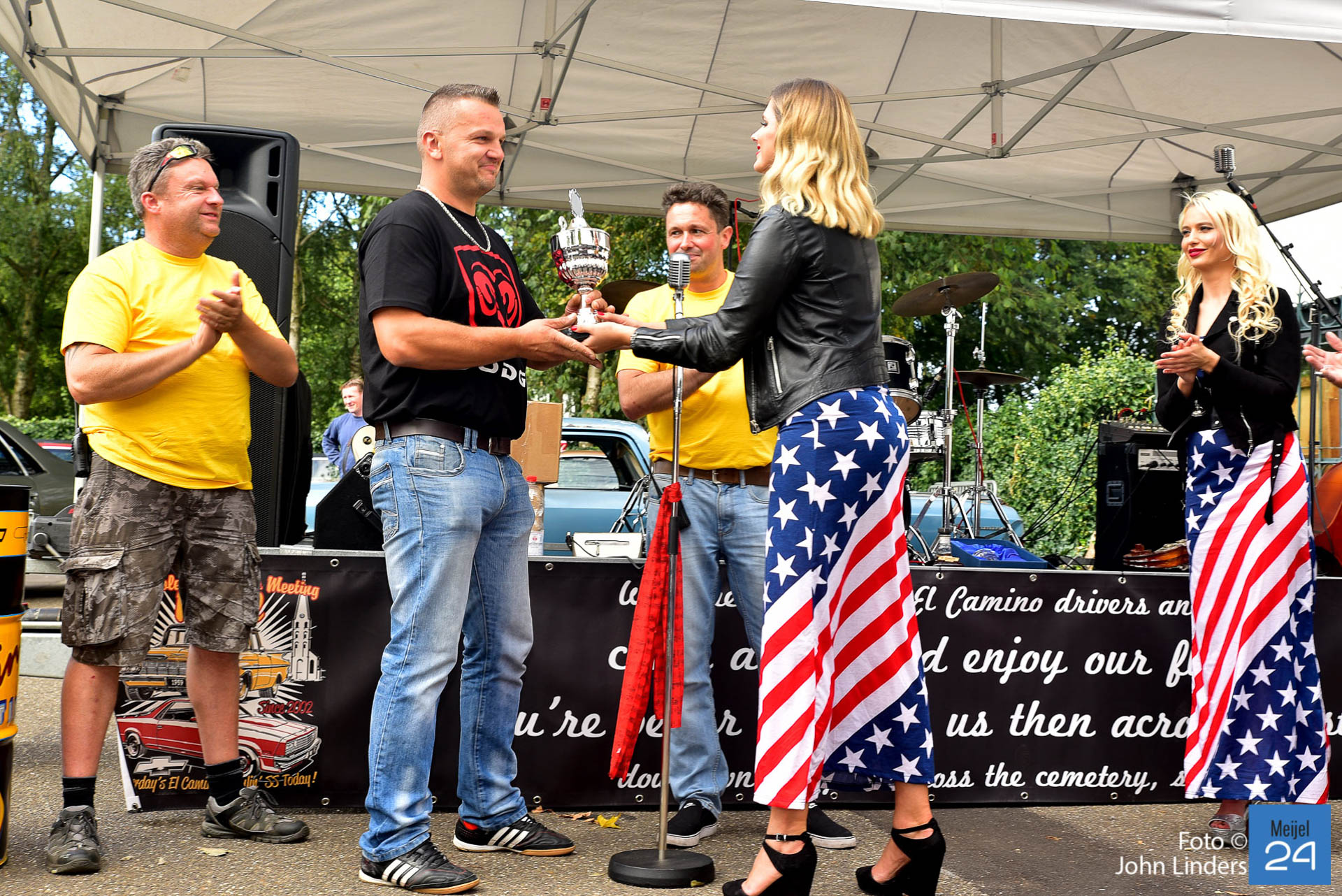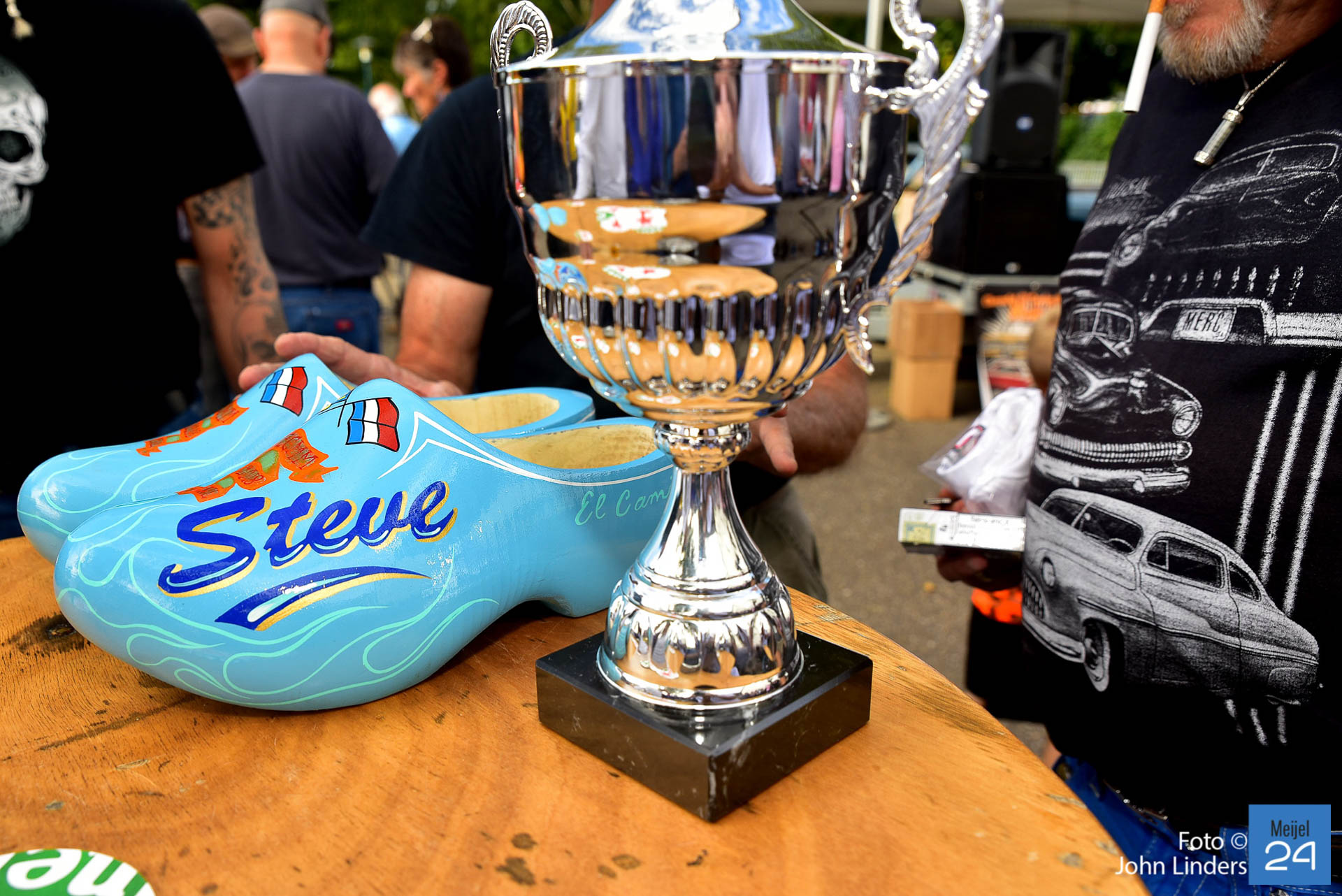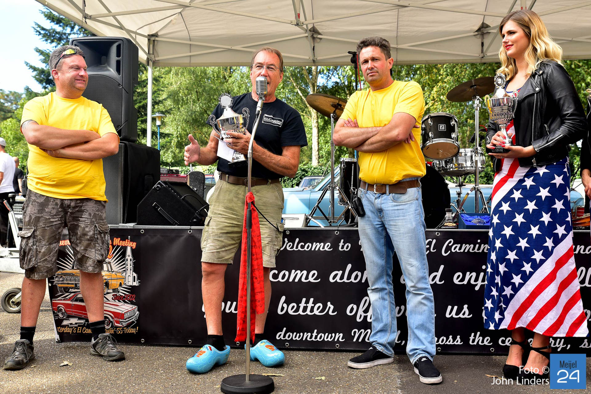 Een van de sponsoren Arie-Jean vintage car restoration schonk 3 bekers. Beker 1 werd uitgereikt aan Steve Winterol uit Florida. Steve was samen met zijn El Camino overgekomen uit de USA speciaal voor de meeting in Meijel. Hij kreeg van de organisatie ook een paar custom made wooden shoes overhandigd. De 2e beker werd uitgereikt aan Fred Roessen uit Naaldwijk. Fred komt al voor de 17e keer naar de El Camino meeting in Meijel. De 3e trofee werd uitgereikt aan de meest extreem originele El Camino uit 1972 van Kristoff uit Duitsland.