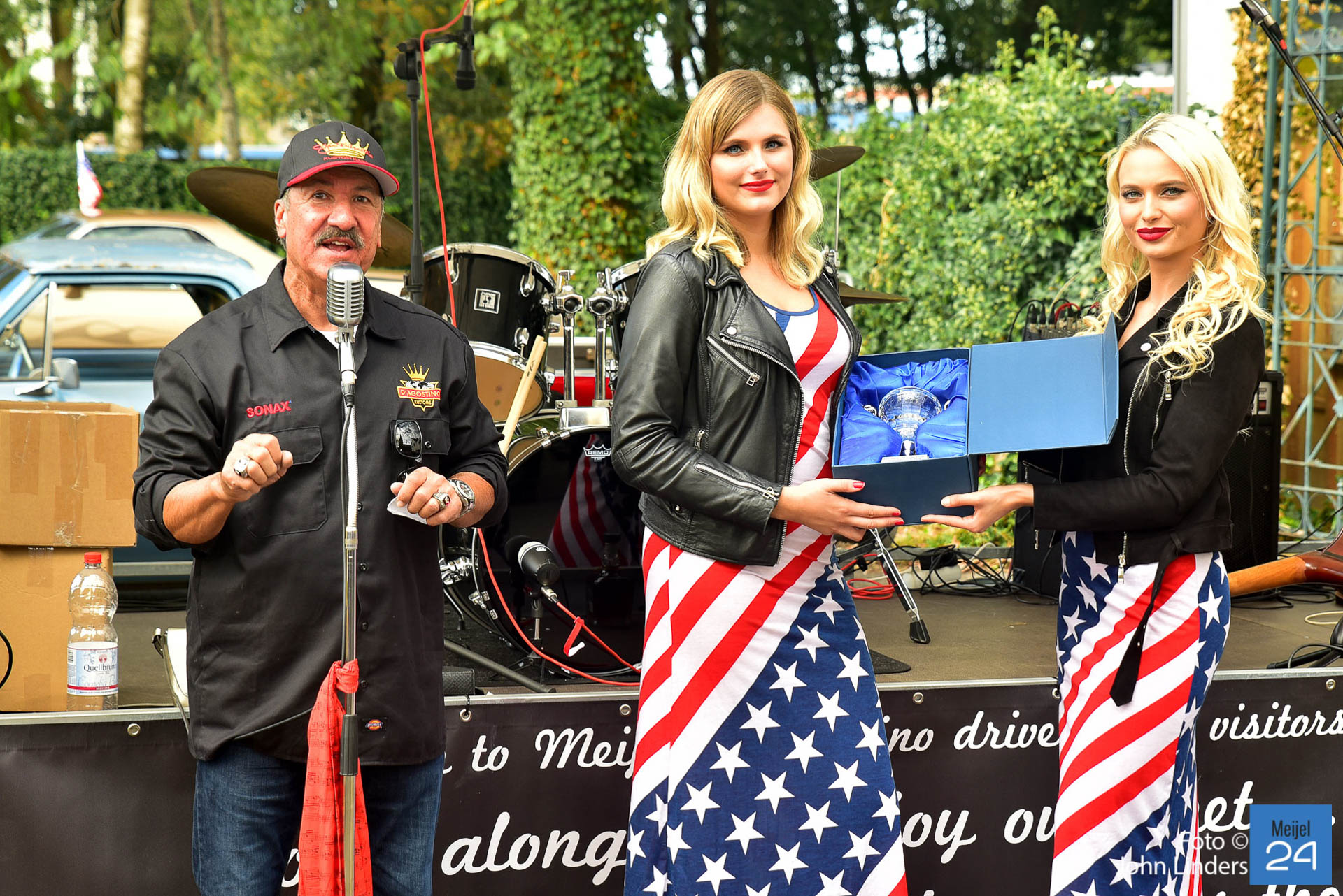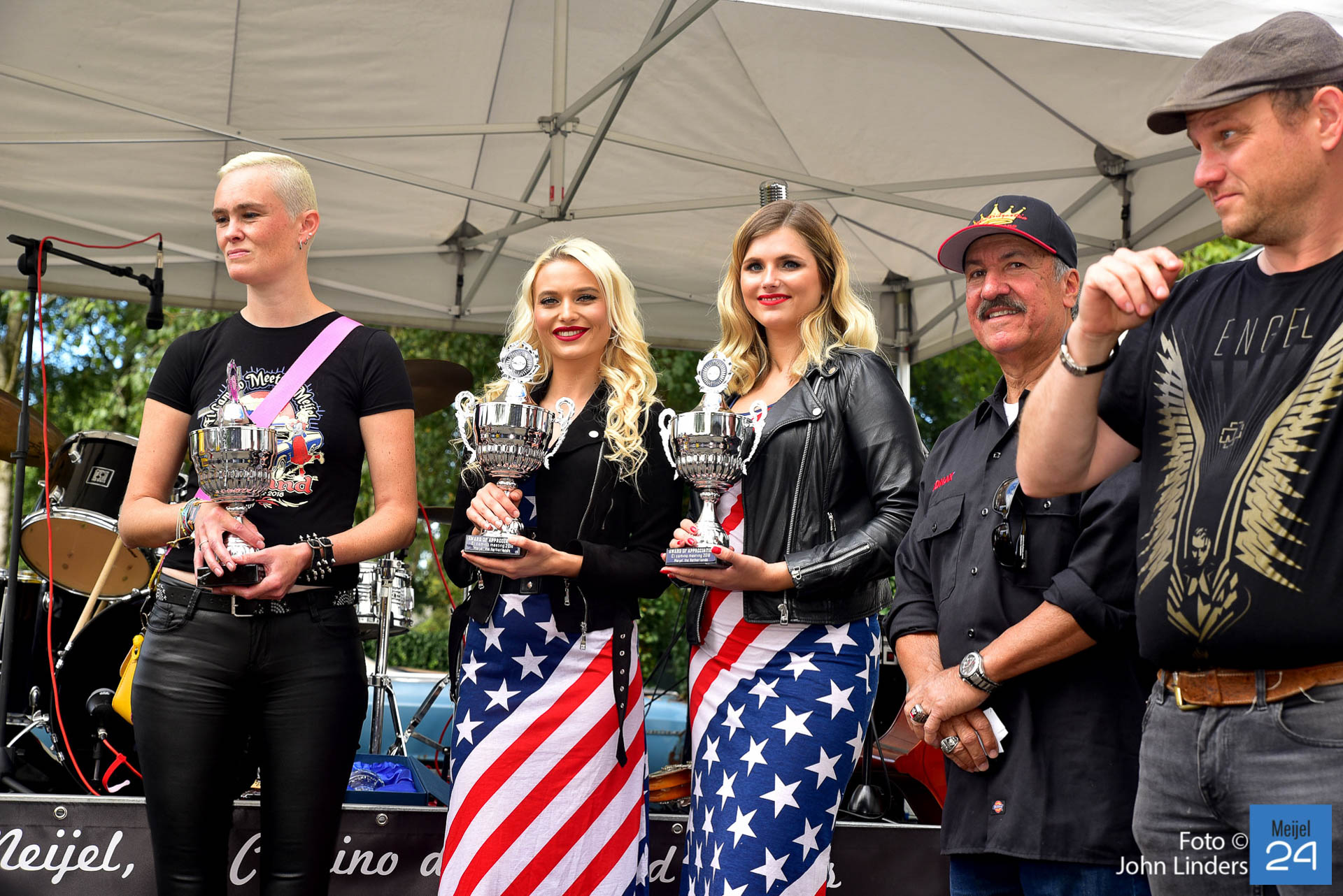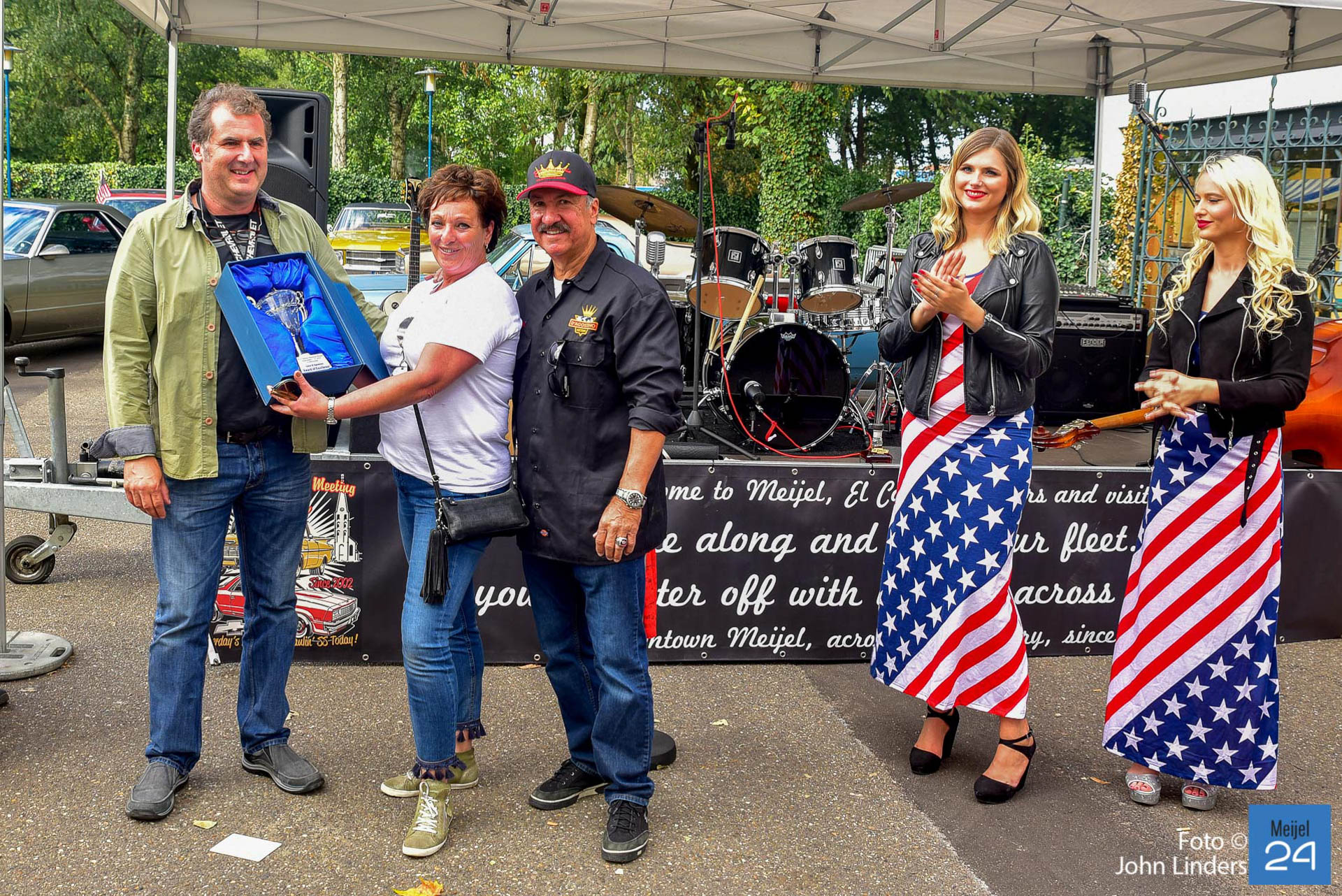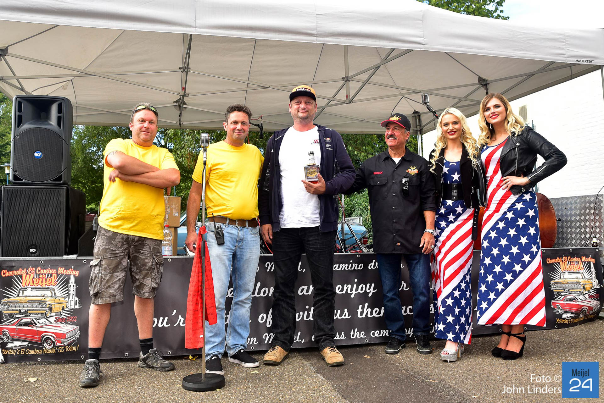 Een van de sponsoren Arie-Jean vintage car restoration schonk 3 bekers. Beker 1 werd uitgereikt aan Steve Winterol uit Florida. Steve was samen met zijn El Camino overgekomen uit de USA speciaal voor de meeting in Meijel. Hij kreeg van de organisatie ook een paar custom made wooden shoes overhandigd. De 2e beker werd uitgereikt aan Fred Roessen uit Naaldwijk. Fred komt al voor de 17e keer naar de El Camino meeting in Meijel. De 3e trofee werd uitgereikt aan de meest extreem originele El Camino uit 1972 van Kristoff uit Duitsland.