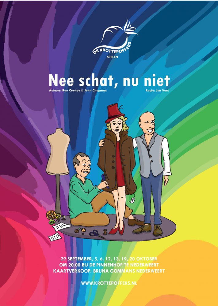 De maand oktober staan De Krottepoffers weer op de planken van de Pinnenhof. Dit keer met de klucht ‘Nee schat, nu niet’. Het bijzondere is dat de twee hoofdrollen door twee jonge mannen van de club worden gespeeld. Sander Caris (28) en Harm Vaas (29) hebben de zware maar mooie taak gekregen om de grootste rollen uit het stuk op zich te nemen. Ervaren mannen als Ben Sonnemans en Jos Breukers doen eveneens mee aan de voorstelling, misschien dat het logischer was om hen deze rollen te geven, maar de toneelvereniging koos voor verjonging.