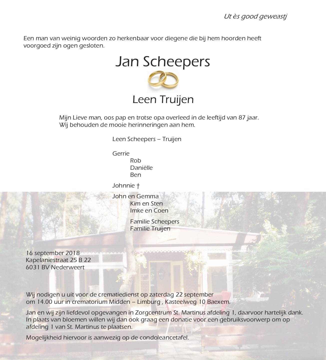 Leen, Gerrie en John, schoonfamilie en kleinkinderen gecondoleerd met dit grote verlies van Jan Scheepers, ik wens jullie heel veel sterkte