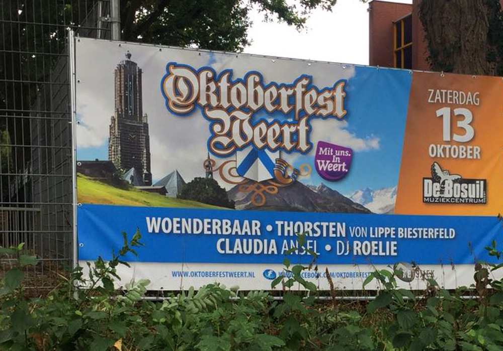 Op verschillende plaatsen in Weert zijn afgelopen week reclamedoeken opgehangen om het ‘Oktoberfest Weert‘ onder de aandacht van het grote publiek te brengen. De doeken zijn blijkbaar in trek bij veel mensen, want een banier die aan de voetgangersbrug over de Ringbaan Zuid was bevestigt én een groot reclamedoek aan het hek bij Muziekcentrum De Bosuil waren na een paar dagen al ontvreemd.