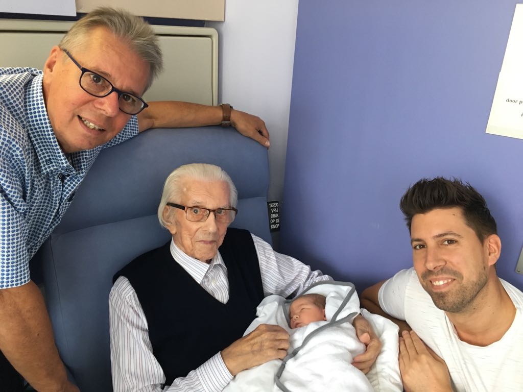 Extra speciaal omdat ook Thieu Caris, 98 jaar, hiermee zijn eerste achterkleinkindje mocht verwelkomen. Op de foto 4 generaties, Nova Caris met Dustin Caris, opa Twan Caris en overgrootpa Thieu Caris.