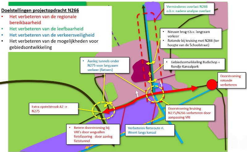 Het voorstel van de stakeholders en shareholders is om de knelpunten op het bestaande tracé van de N266 en N275 op te lossen. Boven in het kaartje staan de 4 doelstellingen van het project N266 Nederweert. Onderstaand benoemen ze per doelstelling de knelpunten/ambities en de oplossingsrichting.