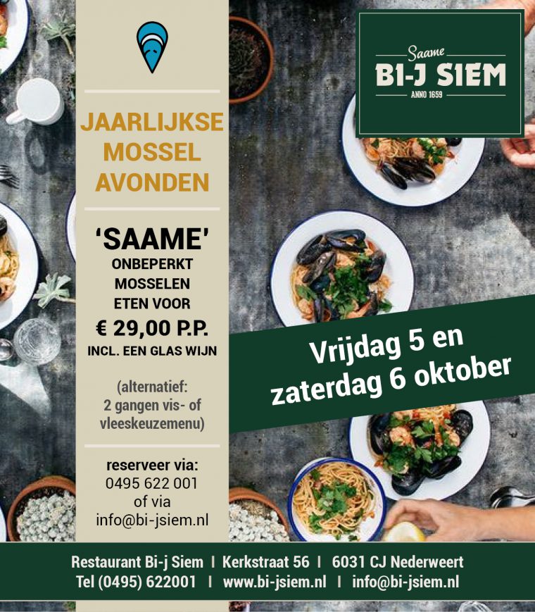 Ook dit jaar staan de traditionele mosselavonden op de agenda. Op vrijdag 5 oktober of zaterdag 6 oktober kun je voor €29,00 per persoon onbeperkt mosselen eten in het oudste horecapand van Nederland. In de prijs is een glas wijn inbegrepen. Lust je geen mosselen? Ook dan ben je van harte welkom! Wij serveren voor dezelfde prijs een twee gangen vis- of vlees keuzemenu. Ook deze editie staat weer garant voor “saame” gezellig tafelen en ‘saame’ genieten. Dus noteer alvast deze datum of je reserveert nu al via 0495 622001 of via www.bi-jsiem.nl