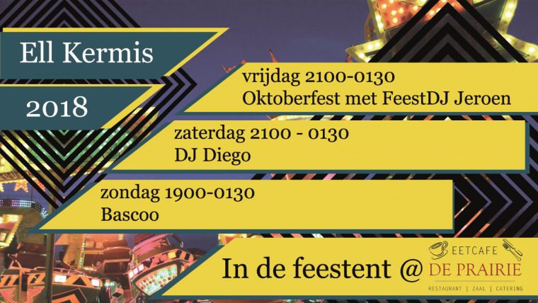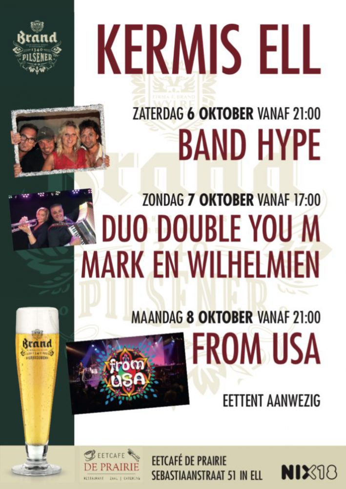 Van zaterdag 6 tot dinsdag 9 oktober is het weer kermis in Ell. Ook Eetcafé De Prairie heeft weer gezorgd voor een gezellig programma. Met de band Hype, Duo Double You M Mark en Wilhelmien én de band From Usa belooft het weer een mooie kermis te worden met fijne muziek.