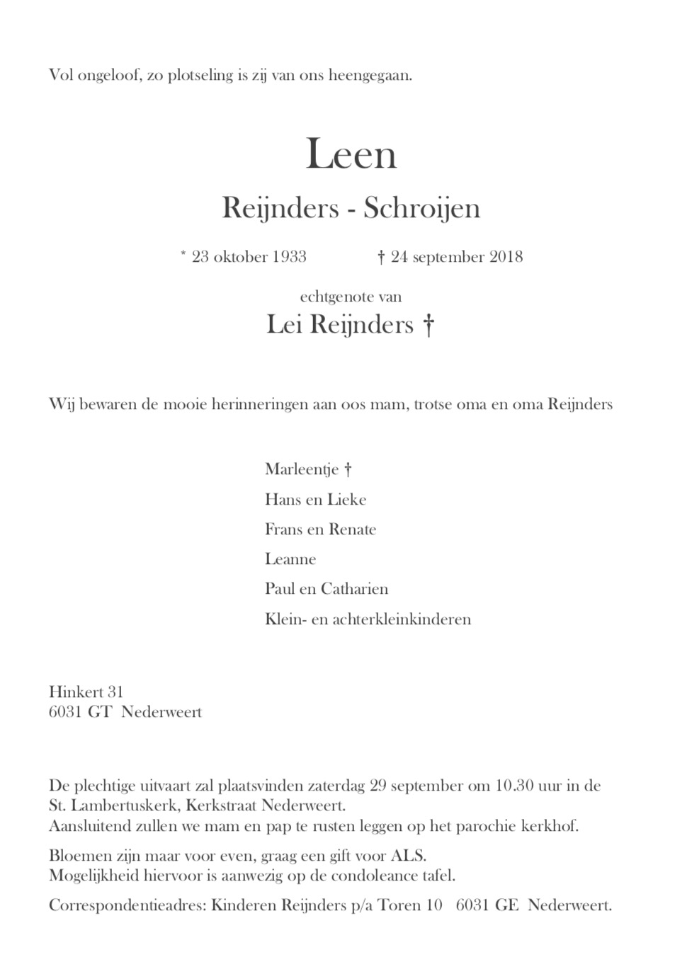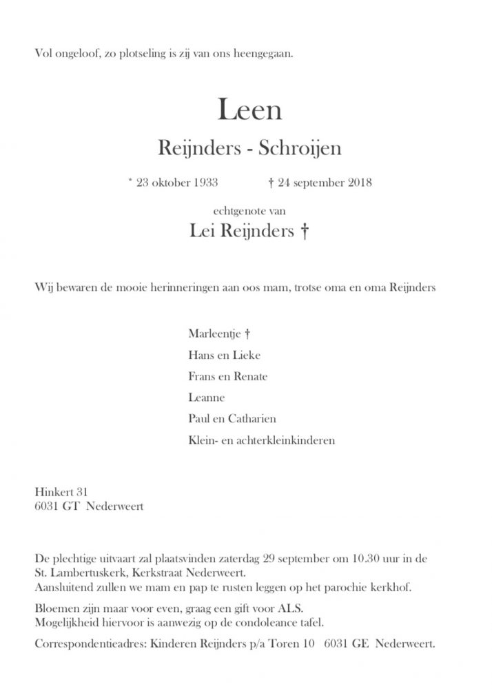 Overlijdensbericht: Leen Reijnders – Schroijen 1933-2018