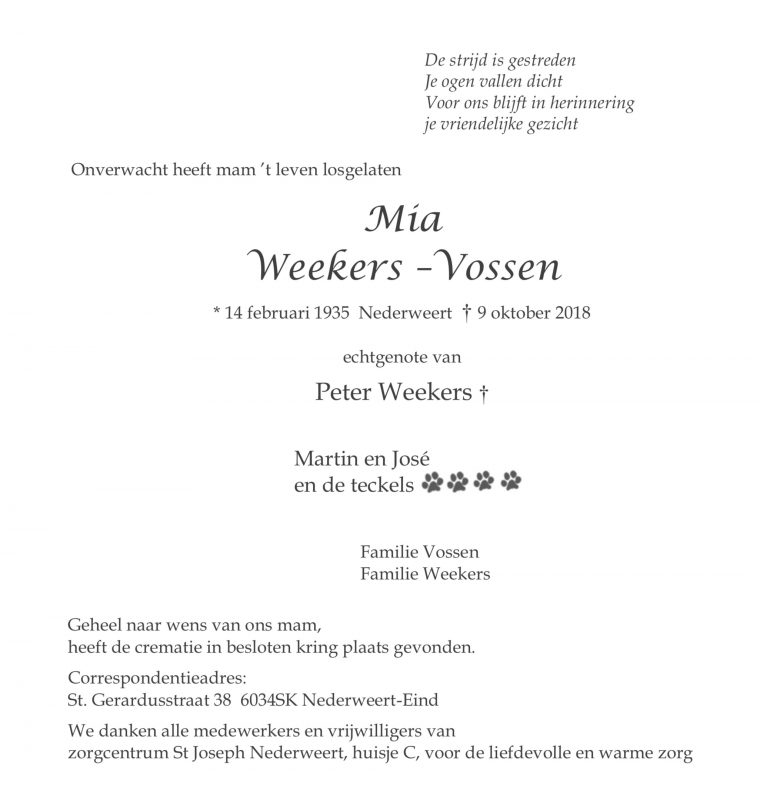 Overlijdensbericht: Mia Weekers –Vossen
