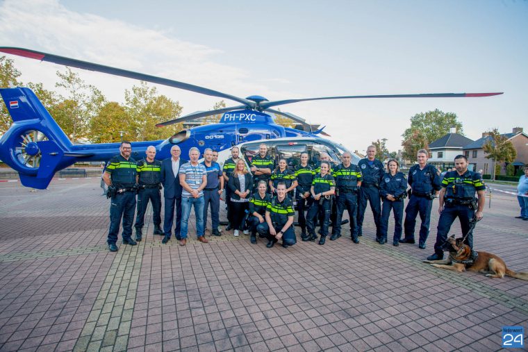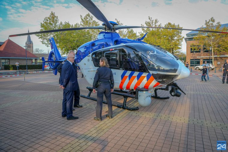 Ook een politiehelikopter deed mee aan de oefening. Rond de klok van 17:00 uur landde deze op het Raadhuisplein in Nederweert. Dat bracht veel bekijks met zich mee.