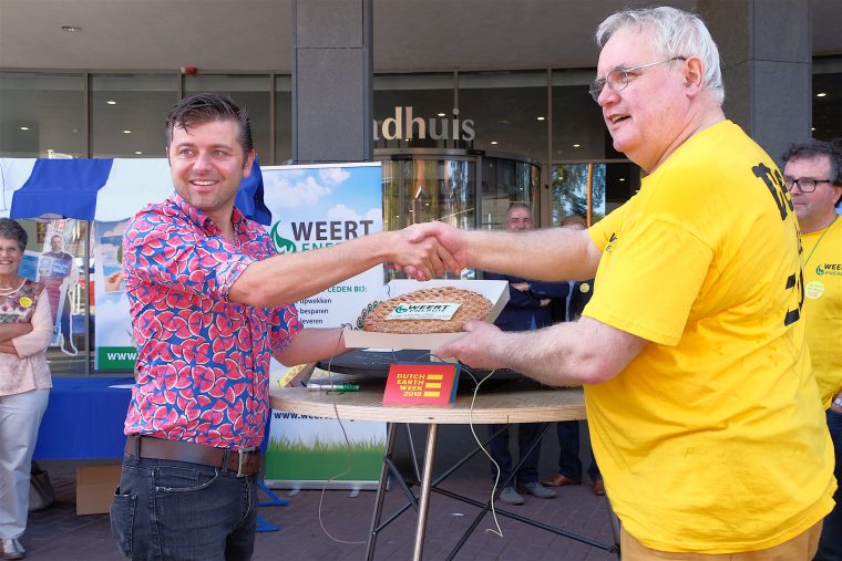 Met de overhandiging van de Weerter vlaai aan wethouder Geert Gabriëls ging afgelopen zaterdag de campagne ‘Echte Weerter vlaai voor echte Weerter stroom’ officieel van start. Dit gebeurde op de energiemarkt, die onderdeel was van de duurzaamheidsweek van de provincie Limburg ‘Dutch Earth Week’ in Weert.
