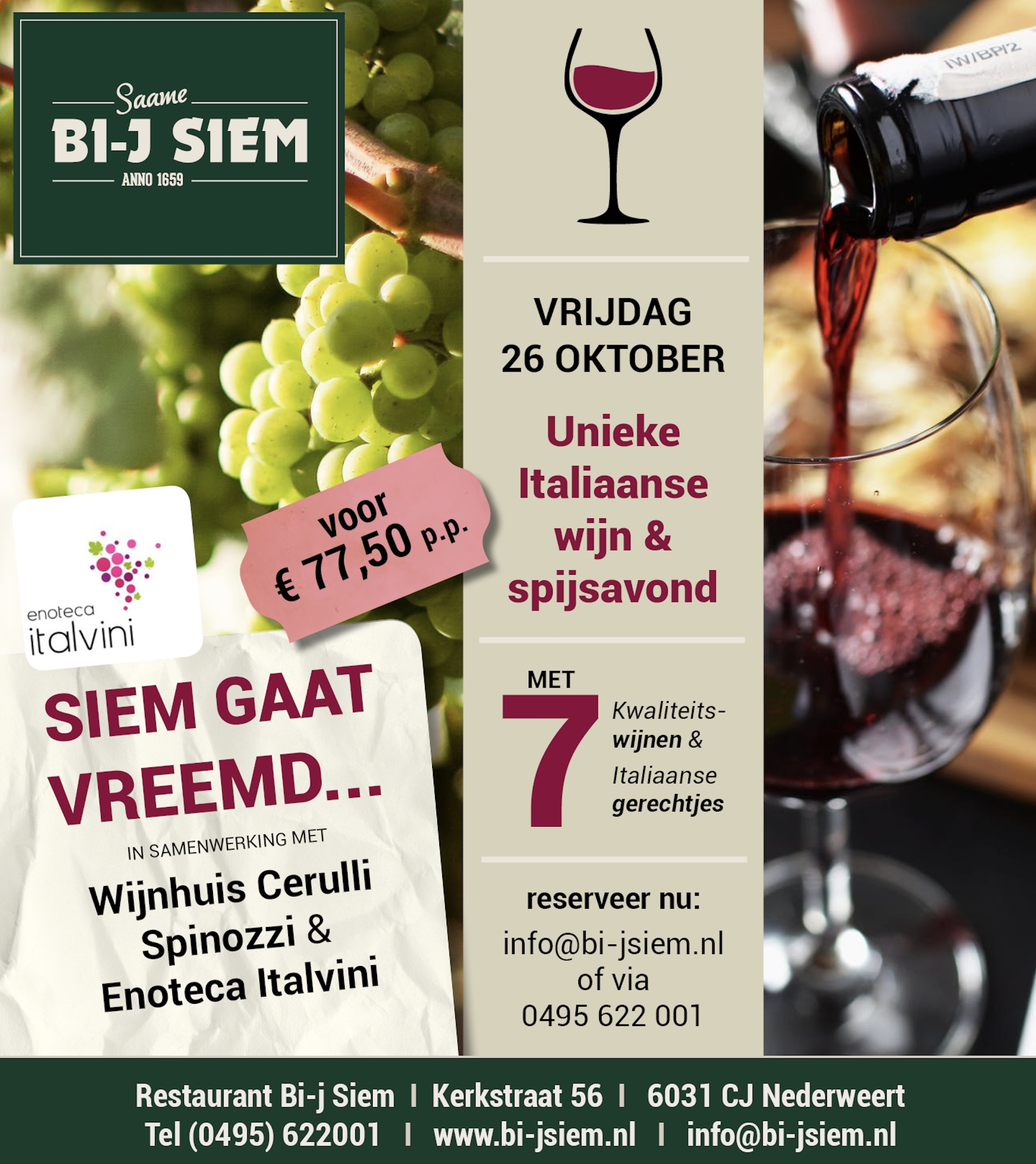 Restaurant Bi-j Siem organiseert op vrijdag 26 oktober in samenwerking met Enoteca Italvini een Italiaanse wijn/spijsavond. Eigenaar van Eneco Italvini is Peter Stals uit Weert. Peter importeert Italiaanse kwaliteitswijnen rechtstreeks van de Toscaanse producenten. Een van deze producenten is Enrico Cerulli van het wijnhuis Cerulli Spinozzi. Hij maakt in de Italiaanse regio Abruzzo wijnen van de autochtone Montelpulciano d’Abruzzo(rood) en de Trebbiano en Pecorino(wit). De wijngaarden liggen in de provincie Teramo en vormen de enigste DOCG regio van Abruzzo. De kwaliteitswijnen worden op biologische basis gemaakt en zijn bekend in binnen- en buitenland.