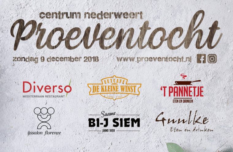 Zondagmiddag 9 december is in het centrum van Nederweert de jaarlijkse Proeventocht. Spreek met vrienden of familie af om samen de proeventocht mee te maken. Gezellig bijkletsen, lekker eten & drinken en samenzijn staan centraal. Ze bieden je een smakelijke tocht door het centrum van Nederweert. Op maar liefst zes locaties kun je, net als voorgaande jaren, genieten van lekkere hapjes en gerechten.