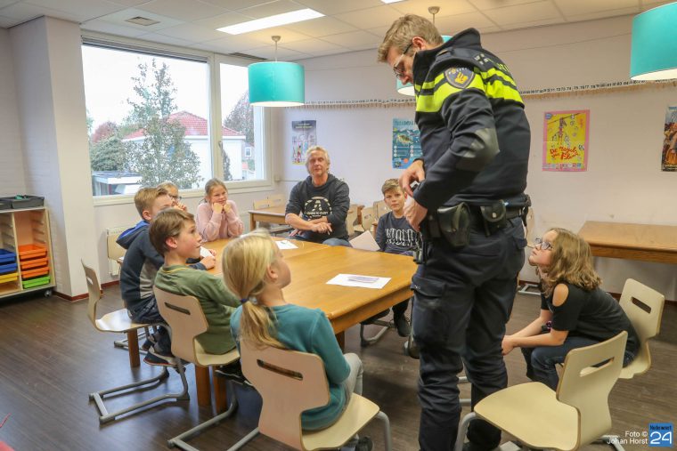 De kinderen hadden zich goed voorbereid en stelden vragen over fietsveiligheid en zichtbaarheid in het verkeer. Voor de kinderen was het reuze spannend toen de wijkagent ook nog over zijn uitrusting begon te vertellen.