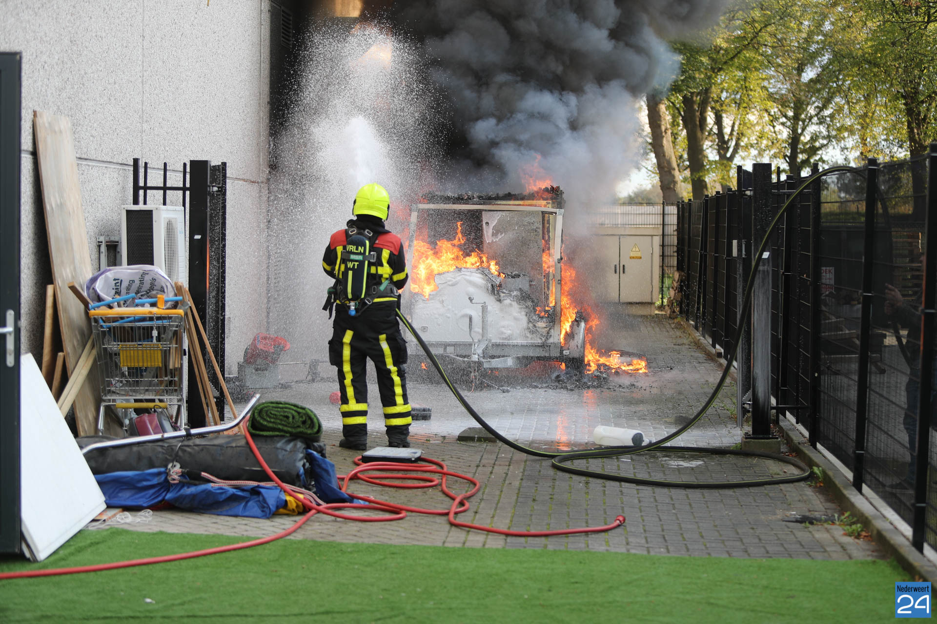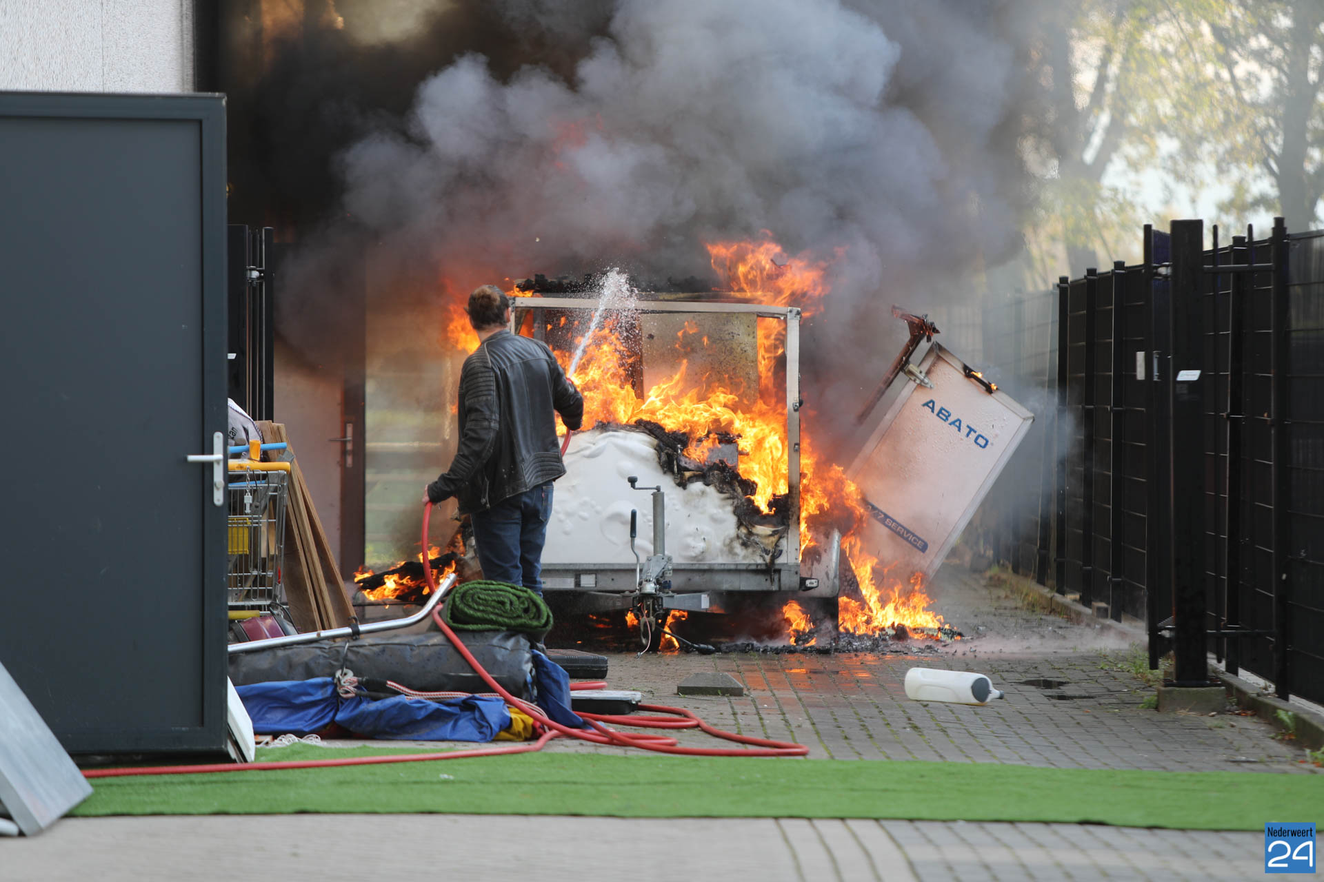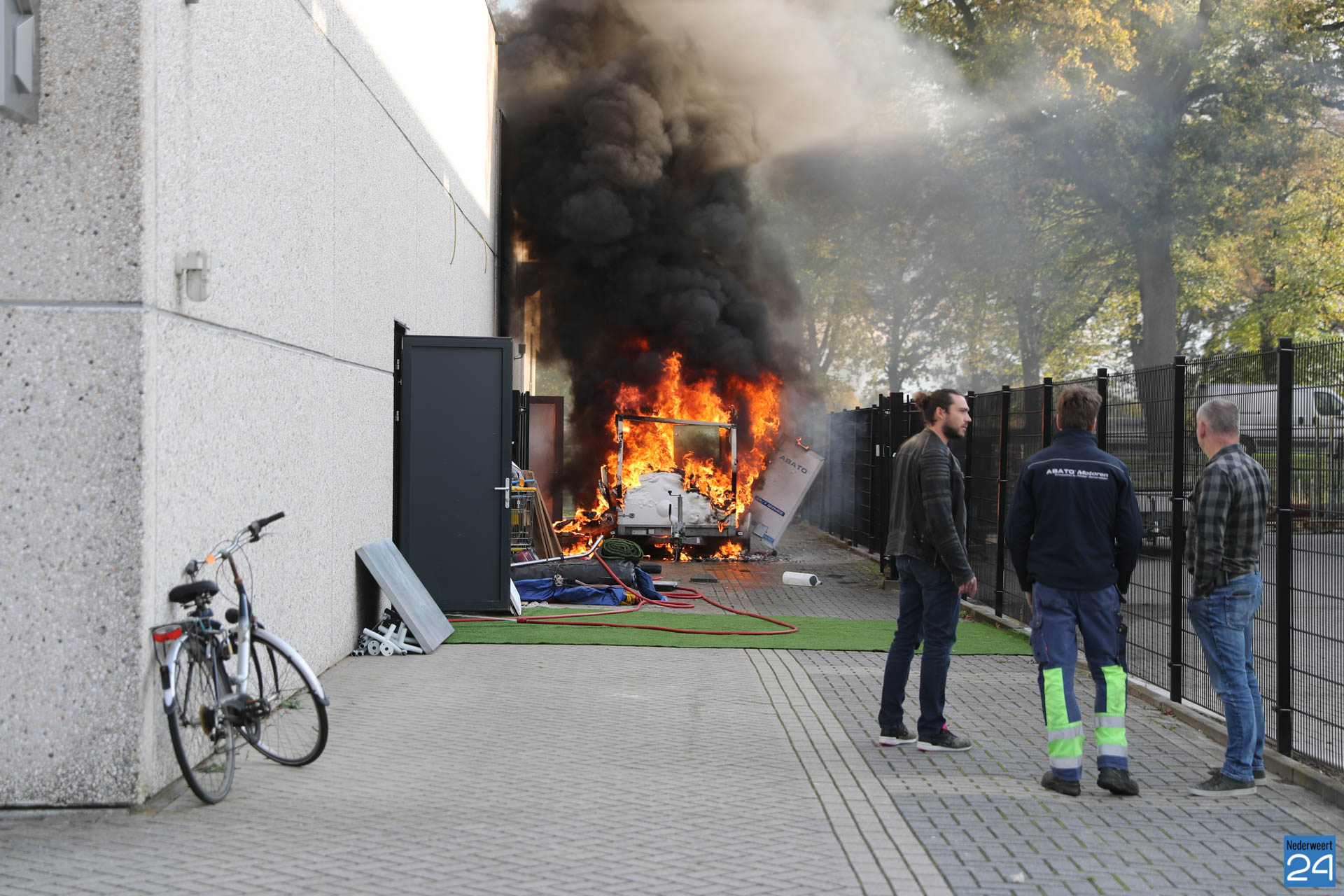 Vrijdagmiddag is een aanhanger volledig verwoest na een felle brand. De aanhanger stond geparkeerd naast een bedrijfsgebouw aan de Magnesiumstraat op industrieterrein Pannenweg II in Nederweert.