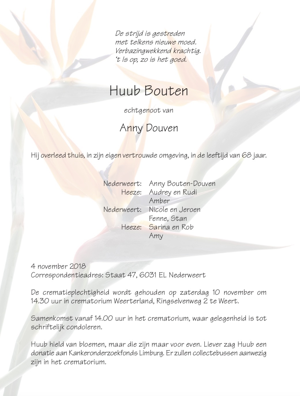 Anny, kinderen en overige familieleden gecondoleerd met het verlies van Huub