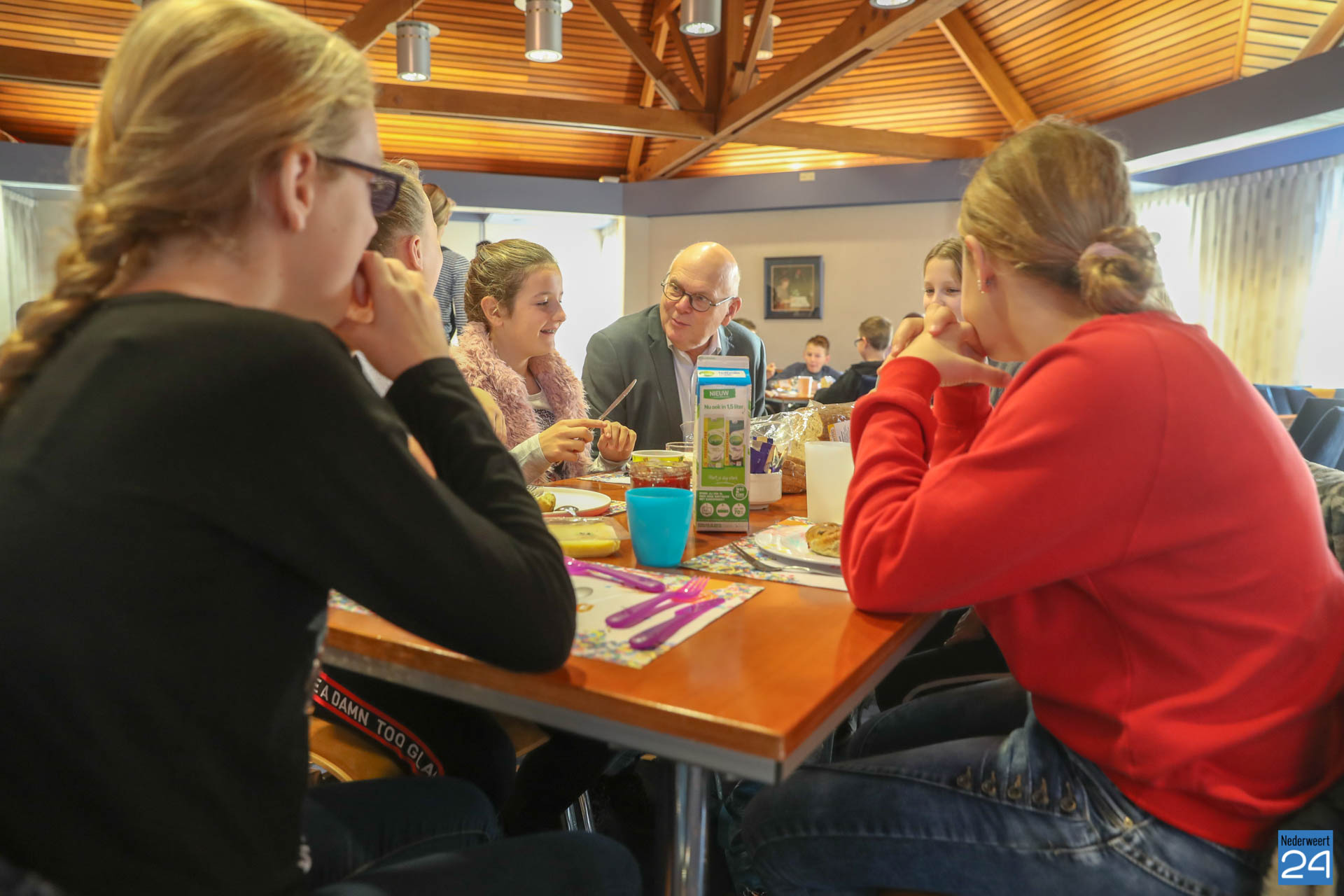 Burgemeester Evers, wethouders Koolen en Cuijpers van gemeente Nederweert onderstreept hiermee, net als zo’n 275 collega-burgemeesters in het hele land, het belang van een gezond ontbijt. Aan de ontbijttafel maakten de kinderen, de burgemeester en wethouders uitgebreid kennis met elkaar en wisselden ze van gedachten. Met het thema ‘Een feestje voor iedereen!’ laat het Nationaal Schoolontbijt zien dat een feestje pas een feestje is als iedereen erbij hoort. Burgemeester Evers kijkt met plezier terug op de bijzondere ontbijtontmoeting.
