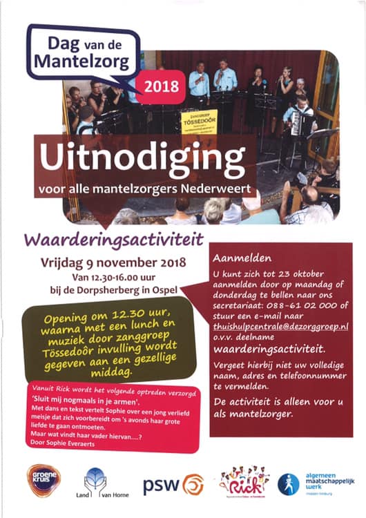 Zaterdag 10 november is de ‘Dag van de Mantelzorg‘. In Nederweert werden daarom vrijdagmiddag de mantelzorgers getrakteerd op een heerlijke lunch met muziek en een optreden van Sophie. De middag in de Dorpsherberg in Ospel werd officieel geopend door wethouder Cuijpers van de gemeente Nederweert. Ruim 70 gasten hadden een fantastische middag.