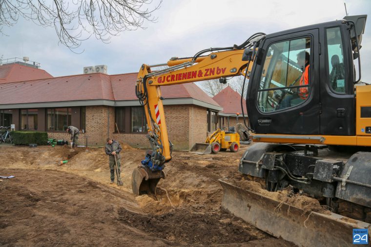 Maandag is gestart met de aanleg van een nieuwe klimaatbestendige groenvoorziening rond (een deel van) het gemeentehuis en het afkoppelen van het regenwater van de daken.