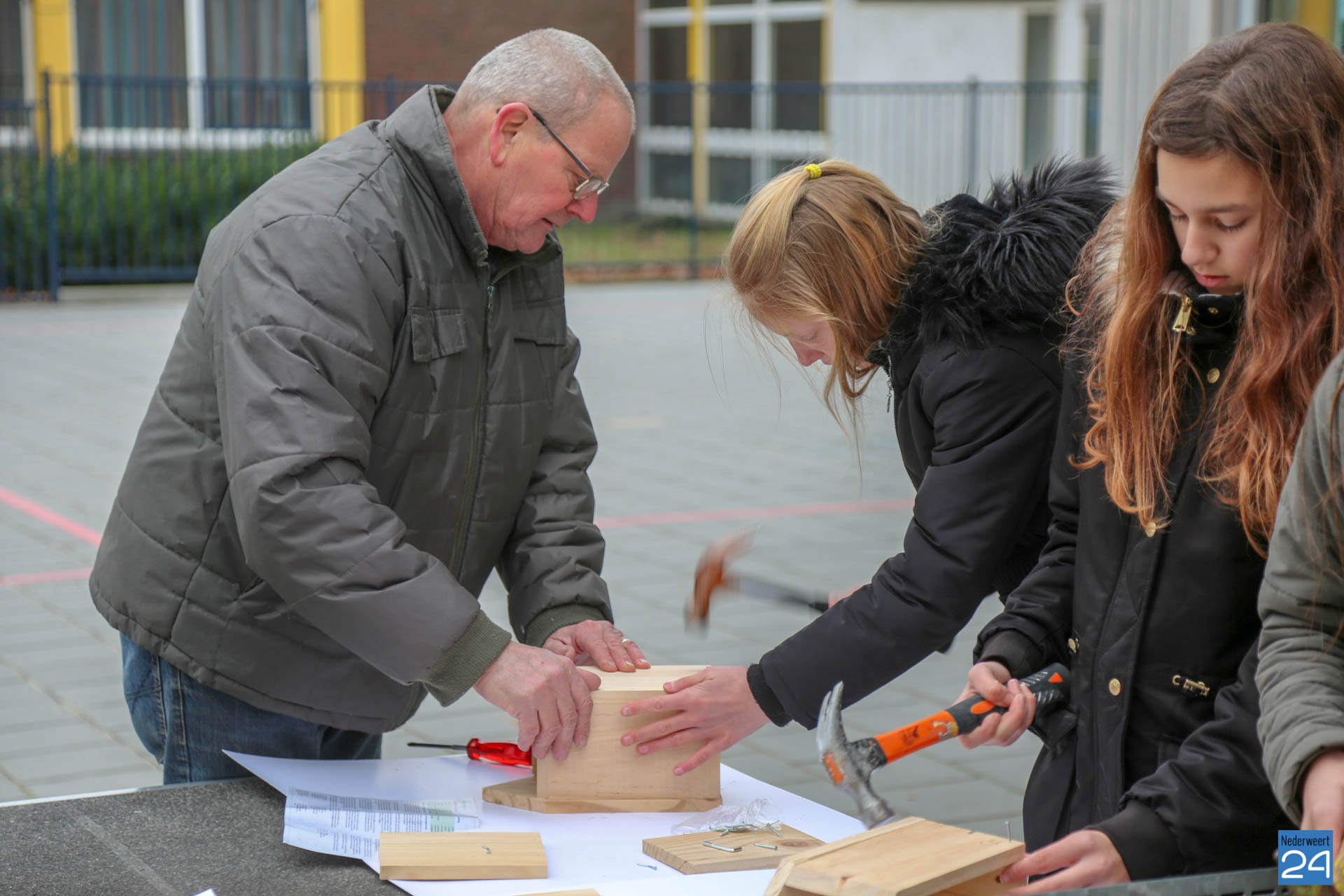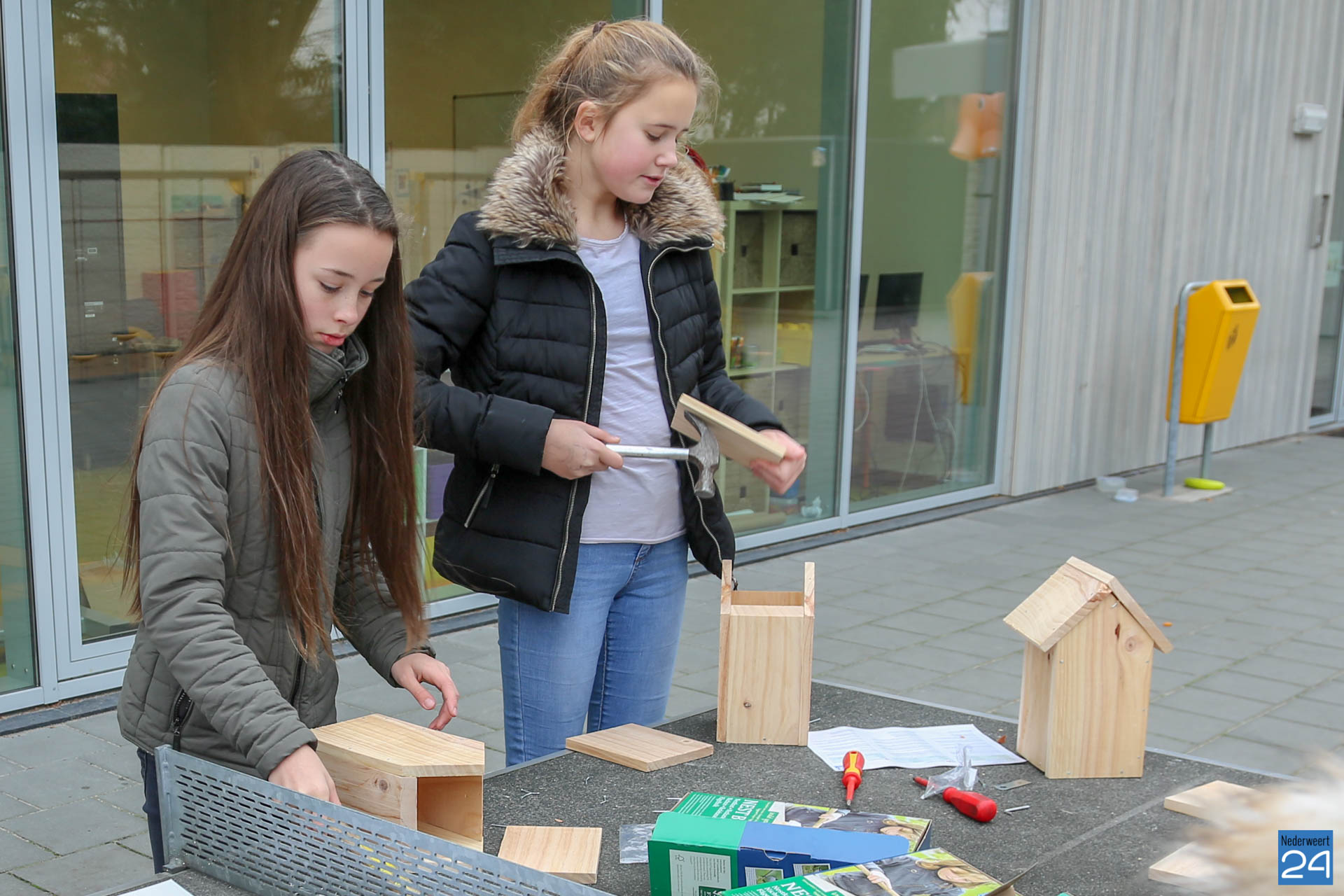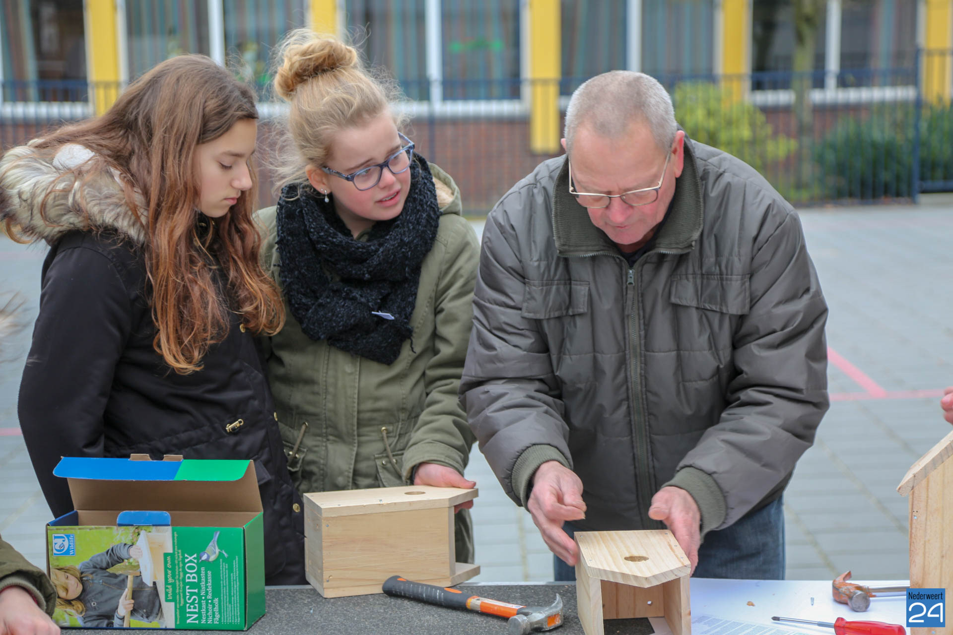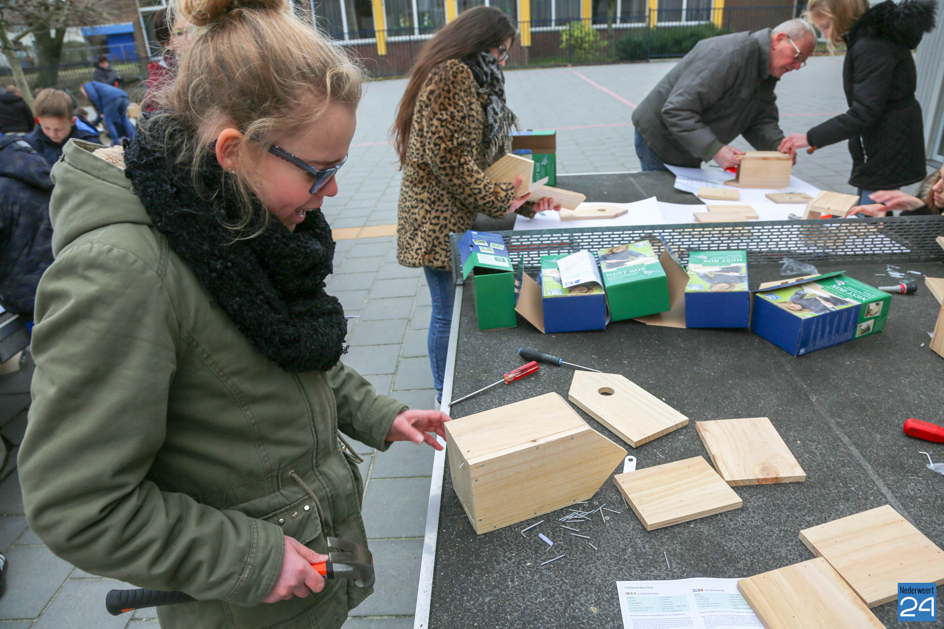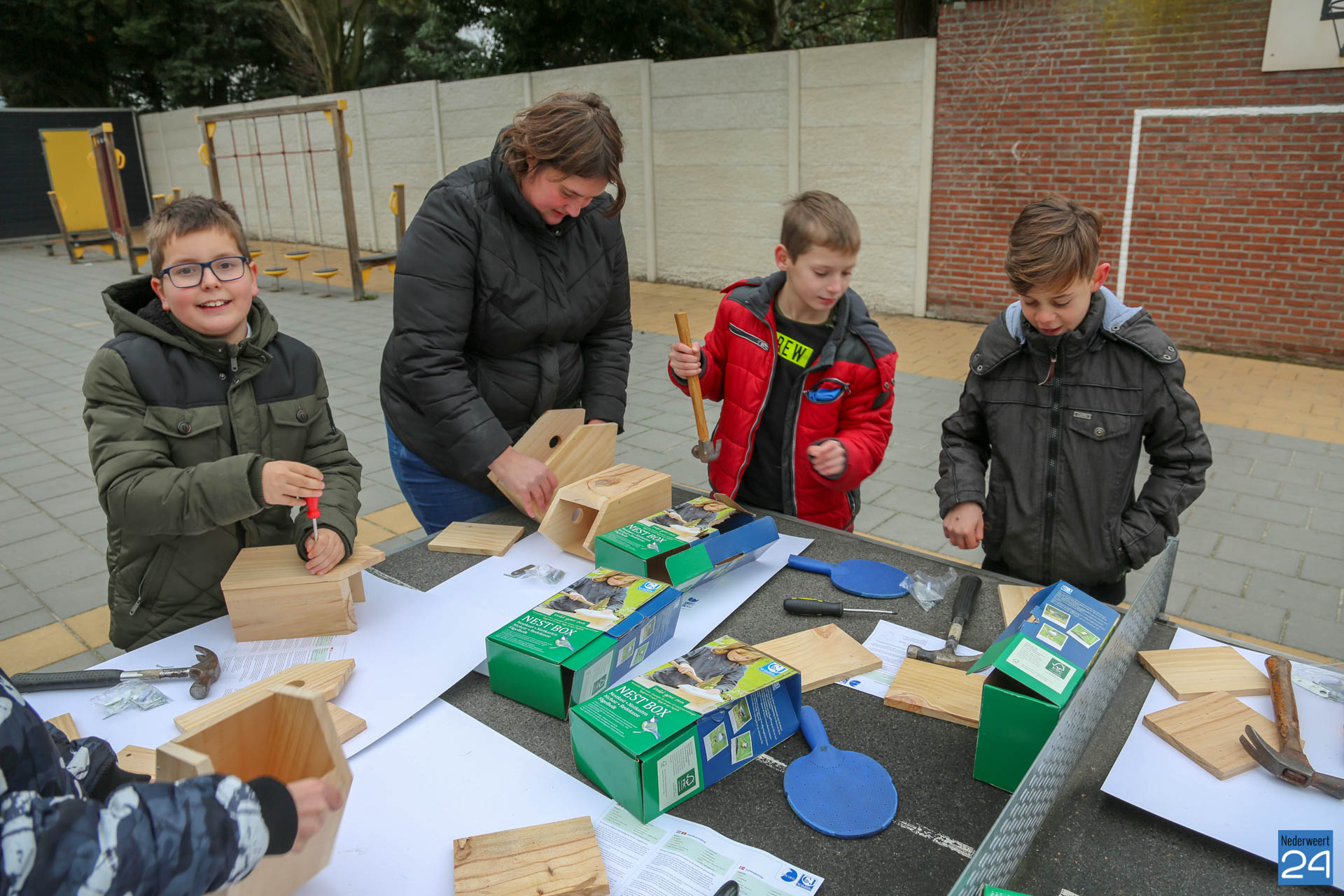 De nestkastjes die vrijdagmidag zijn gemaakt, krijgen een tijdelijk plekje in het nieuwe Kanaalpark ‘De Heerlijckheid’. ”Een mooi voorbeeld van samenwerken in de wijk,” zegt lerares Peggy Sangen. De leerlingen zijn vol enthousiastme, samen met ouders en opa’s, aan de slag gegaan.