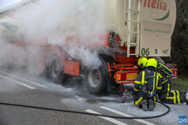 Waarschijnlijk zijn vastgelopen remmen de oorzaak. De brandweer heeft het vuur definitief geblust en een nacontrole uitgevoerd. De N275 werd tijdelijk afgesloten. Niemand raakte gewond.