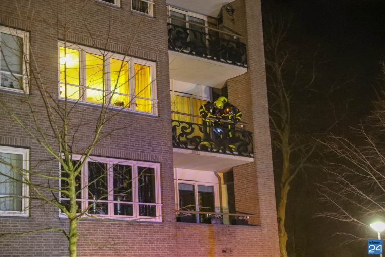 De brandweer zette een hoogwerker in om op het balkon te komen. Door snel ingrijpen bleef de schade beperkt. Er raakte niemand gewond.