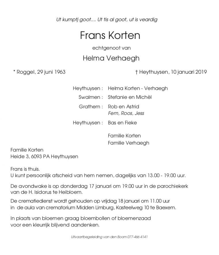 Helma , kinderen en kleinkinderen gecondoleerd met het overlijden van Frans.