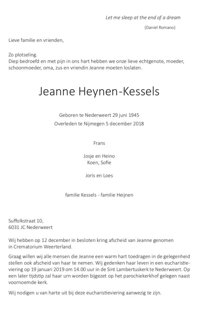 Overlijdensbericht: Jeanne Heynen -Kessels