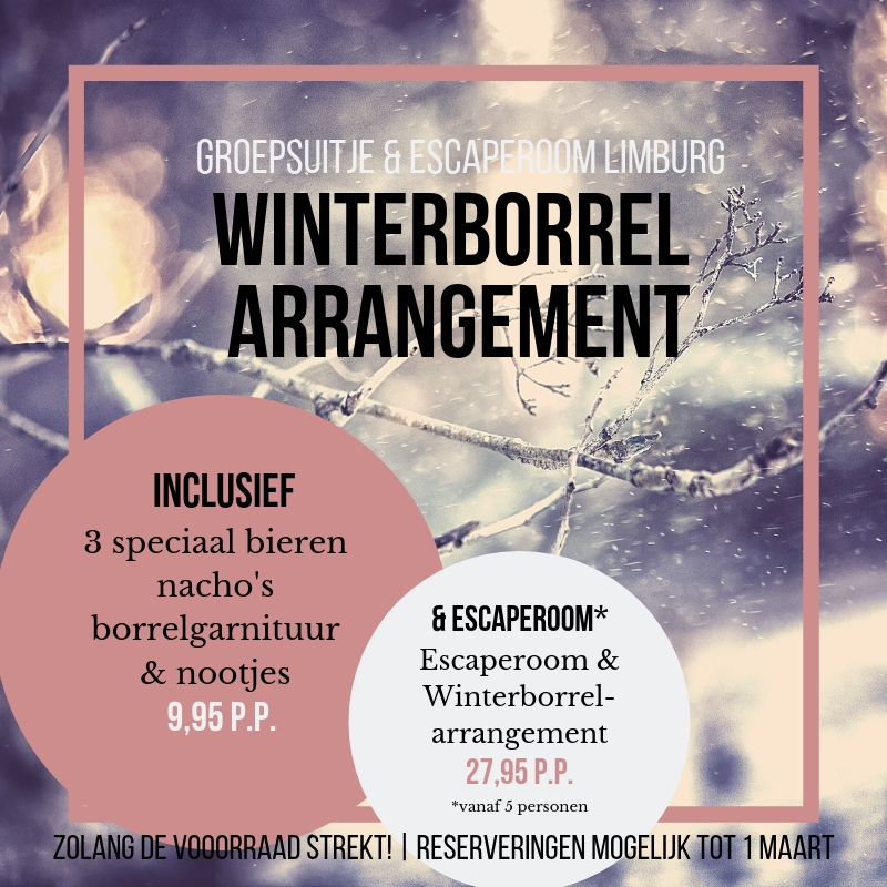 Brrr… wat is het koud! Het vriest dat het kraakt én er wordt sneeuw voorspelt. Weer om lekker binnen….. juist, te borrelen! Geniet van de eenmalige winterborrelactie bij Groepsuitje Limburg & Escaperoom Limburg, zolang de voorraad strekt! Op=op! Kijk voor meer informatie op de website.