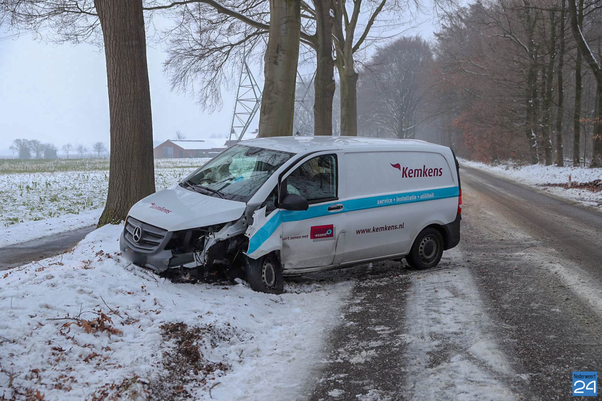 De bestelbus reed vanuit Baexem richting Grathem. Halverwege raakte hij in de slip, kwam links van de weg, botste tegen een boom en kwam vervolgens rechts in de berm tot stilstand.