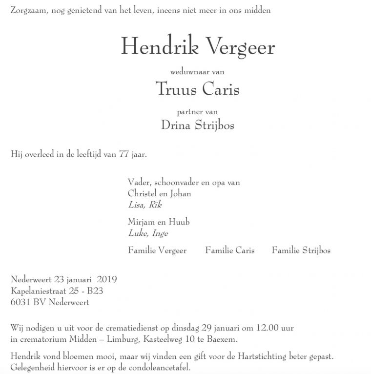 Gecondoleerd met het verlies van Hendrik, fam. Vergeer, Caris en Strijbos! Afgelopen dinsdagochtend nog samen koffie gedronken bij Gasterij de Ontmoeting! Namens Elly en Jo de Wit, Math Duits en Ton Caris.