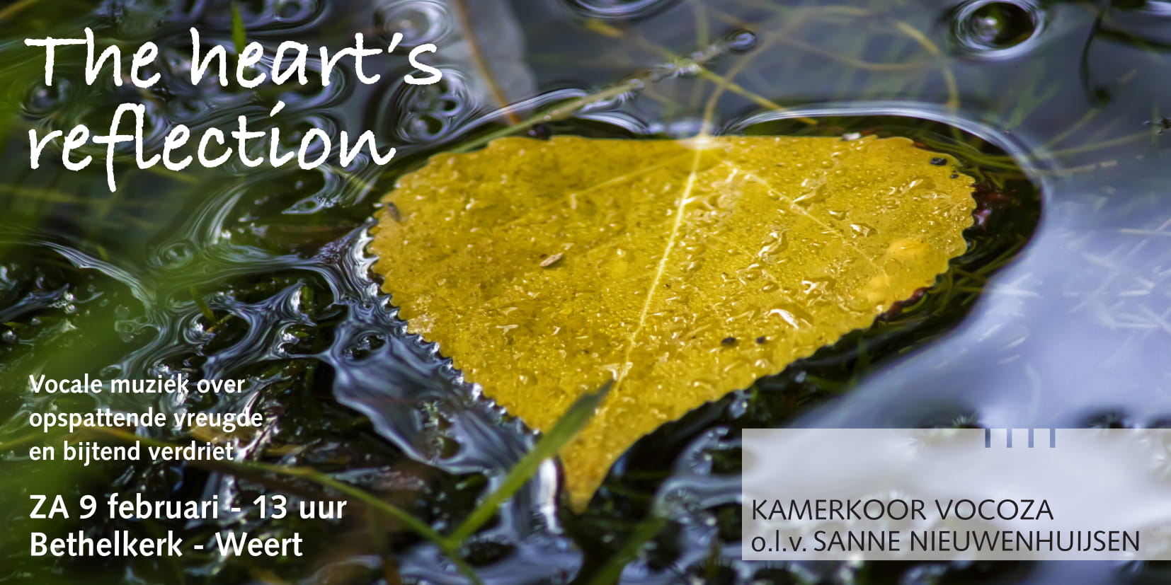 De titel van dit lunchconcert is: ‘The heart’s reflection’: opspattende vreugde, en vallende tranen van intens, bijtend verdriet. Wat in ons leven gebeurt, weerspiegelt zich in de roerselen van ons hart. Schiet vol bij het fascinerende weefsel van Edmund Rubbra in zijn Tenebrae Nocturnes, het donkere De nevel dekt ons van Johannes Verhulst, en word getroost en omhuld door Arvo Pärts verstilde The deer’s cry. Vanuit de duisternis klinkt een roep om de zon van de gerechtigheid in O Radiant Dawn van James MacMillan. Waar Daniel Elders In your light en The heart’s reflection nog van ingehouden vreugde getuigen, is het feest met drie korte Russische miniaturen van Georgy Sviridov en een razendsnel Cantate Domino van Hyun Kook.
