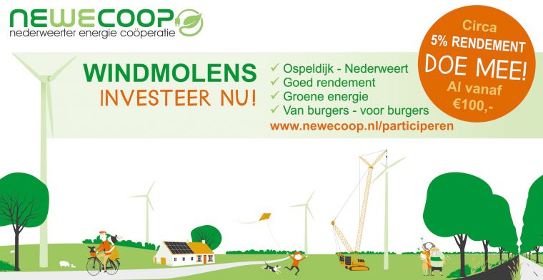 Het is fantastisch om als burgers samen de kans te grijpen om zelf eigenaar te worden van energieprojecten in de gemeente Nederweert of regio. Zo heb je zeggenschap, blijft de winst in de eigen regio en draag je een steentje bij op weg naar een gemeente die leefbaar blijft, ook voor de generaties hierna. Er is nog volop mogelijkheid om zelf ook te investeren. Kijk op www.newecoop.nl/participeren/. Inmiddels is circa € 350.000 door de leden bij elkaar gebracht voor de komst van de windmolens.