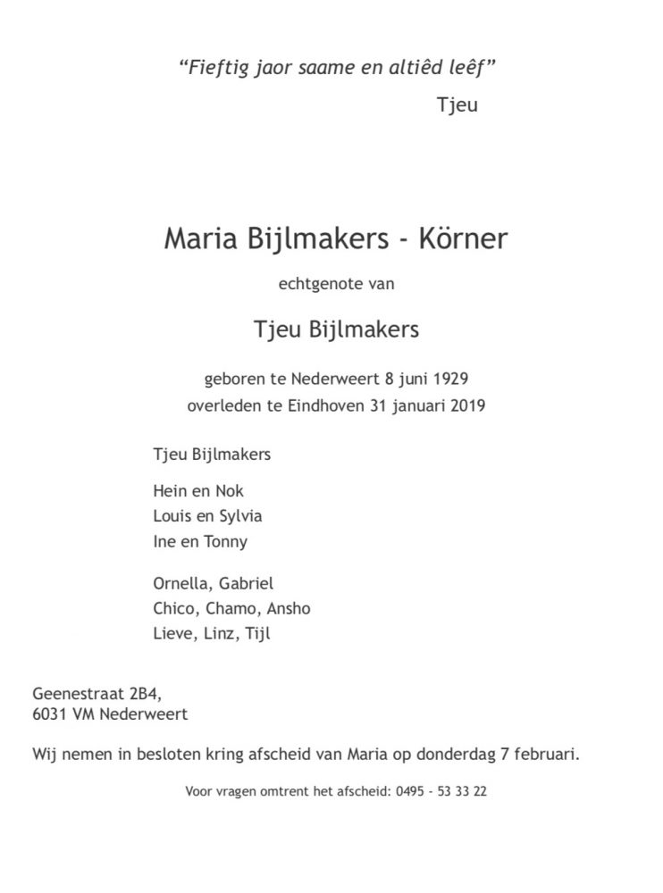 Overlijdensbericht: Maria Bijlmakers – Körner