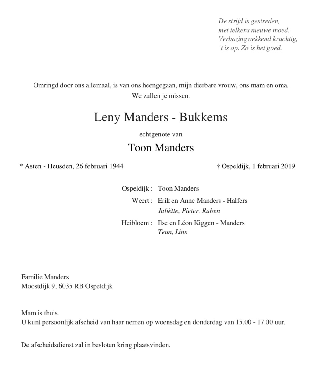 Overlijdensbericht: Leny Manders – Bukkems