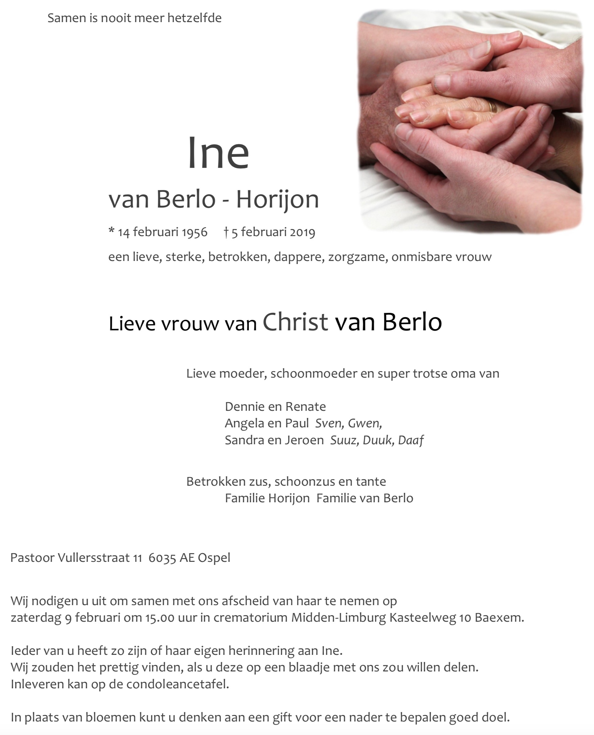 Christ en kinderen en kleinkinderen en familie heel veel sterkte met het overlijden van Ine..