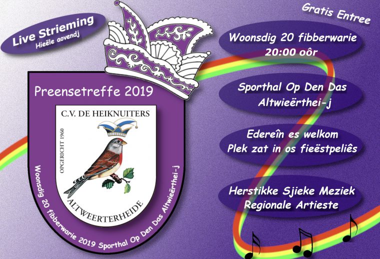 Op woensdag 20 februari aanstaande is het Preensetreffe in de Hei-j. Op deze feestavond komen alle Prinsen met hun gezelschappen van de hele regio bij elkaar. Een traditie die al jarenlang voort duurt. Voorheen was dit het treffen van W.T.V. waarbij door Vrouwtje televisie opnames van de gezelschappen gemaakt werden. Maar dit groeide meer en meer uit naar een geweldige feestavond. De laatste jaren wordt de regie in handen genomen door de organiserende vereniging. Voor dit jaar is dat C.V. De Heiknuiters. Deze hebben ook meteen groot uitgepakt! Ze hadden immers de smaak te pakken na het recente 12×11 festijn. De hele sporthal Op den Das in Altweerterheide is afgehuurd voor deze feestelijke avond met alle hoogheden, artiesten en feestgangers.