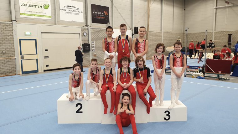 Al vroeg in de ochtend startte de eerste wedstrijd. Hierin mochten de 1e divisie turners en de 4e divisie instappers beginnen. Door gebrek aan Limburgse concurrentie in de 1e divisie moesten Stan Smits van Waesberghe, Niels Boelens, Milan Beek, Roel Geerlings en Thijn van der Heijden onderling gaan strijden voor de ereplaatsen. Bij de instappers pakte Niels met een prachtige vloeroefening het goud. Stan zat hem vlak op zijn hielen en behaalde, mede door een sterke voltige oefening het zilver. Milan maakte het drietal compleet en liet zien hoeveel hij de afgelopen maanden heeft geleerd. Bij de pupillen 1e divisie was het Roel die er met het goud vandoor ging. Hij turnde een stabiele wedstrijd en liet ook zijn nieuwe, moeilijkere oefenstof zien. Thijn liet zien dat ook hij wel degelijk in de 1e divisie thuishoort met een mooie rekstokoefening met salto en super oefeningen op ringen en sprong.