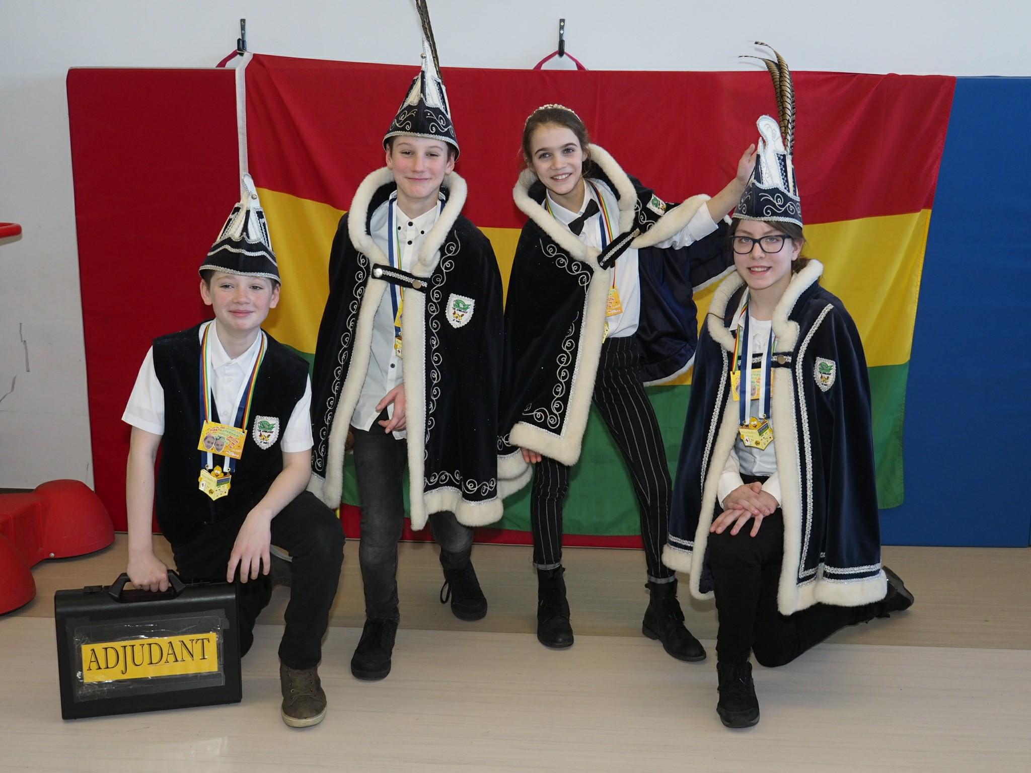 Hier zijn ze dan, de hoogheden: prins Julian I en prinses Jill. Zij regeren de komende weken over onze basisschool, geassisteerd door hun adjudant Lars en vorstin Sanne.