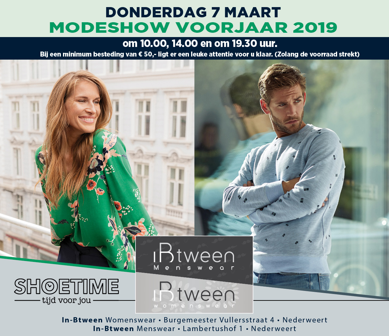 Natuurlijk komt de herenmode van In-Btween Menswear ook aan bod. Met merken zoals Cast Iron , Vanguard , Meyer en nog veel meer. De sets zullen worden af gestyled met trendy schoenen van Shoe-Time Nederweert
