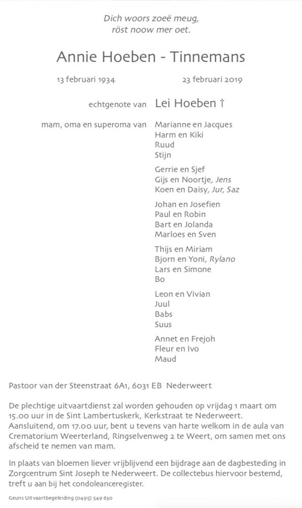 Overlijdensbericht: Annie Hoeben – Tinnemans